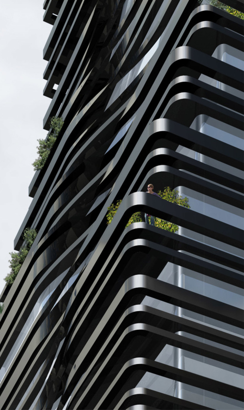 The strategic twisting and torquing façade bands further serve as essential functional elements of the tower, transforming into balconies for more than half of the building’s residences, terraces for the penthouses at the top, and sunshades that deflect heat and protect all of the structure’s interiors from excess sunlight. These metal bands also serve to frame panoramic views from inside the building’s residences and to ensure a level of intimacy and privacy.