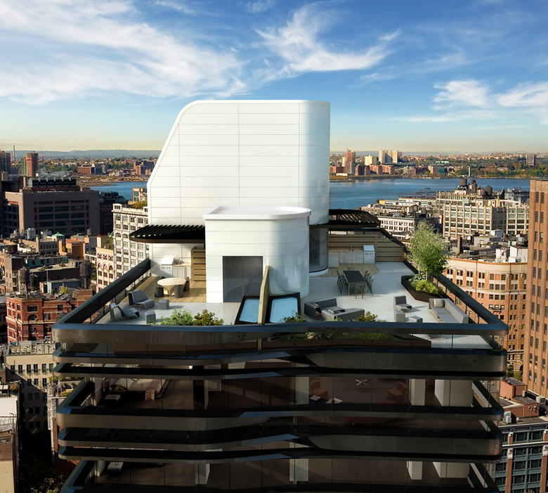 The lower part of Five Franklin Place is framed between neighbouring buildings on two sides, north and south. The Loft Residences are located on these floors with 20’ double height living rooms and floating upper level mezzanines configured to bring daylight deep into the apartments. The City Residences on the middle floors are characterized by 270 degree views and generous floor plans with expansive paved terraces on the east and west sides of the building. The three Sky Penthouses at the top of Five Franklin Place have spectacular panoramic views of the Manhattan’s West Side to the Hudson River, private cylindrical glass elevators wrapped by a curved, cantilevered floating staircase, operating fireplaces, master baths with panoramic views and expansive slab terraces with outdoor Sky Spas and entertaining areas.
