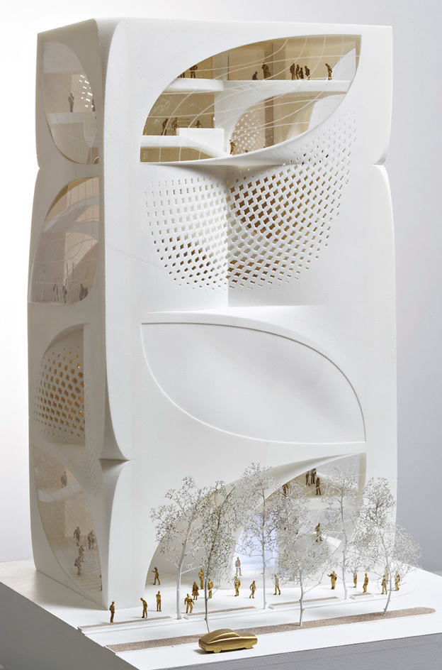 In this design, the element that holds the vision together and moves through all the scale levels is the leaf shape. Both the façades and the floor plans are characterized by large, leaf-shaped perforations and indentations that sweep over several floor levels. The leaf is thus found in the floor plan, in the section and in the elevation. It has been applied to the construction as well, responding to location-specific constructional demands.