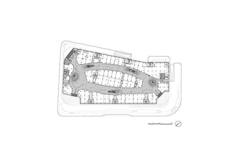 The concept of synergy of flows is key to all of the design components; the fluid articulation of the building envelope, the programming of the dynamic façade lighting and its content design and the interior pattern language which guides customers from the central atria to the upper levels and throughout the building via linking corridors. The interior concept is developed around the North and South atria, creating two different, yet integrated atmospheres. Variations in geometry, materials and details define these differing characters. The North atrium is characterized by warm golden and bronze materials reflecting a cultural, traditional identity. In the South atrium silver and grey nuances with reflective textures reflect the city identity and its urban rhythm. Both atria are crowned by skylights with a funnel structure which connect the roof and the ground floor, in addition to integrating the panorama lifts.