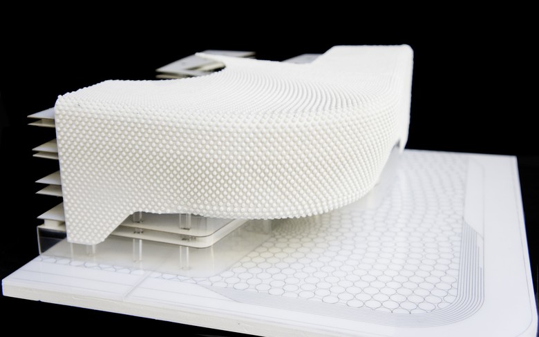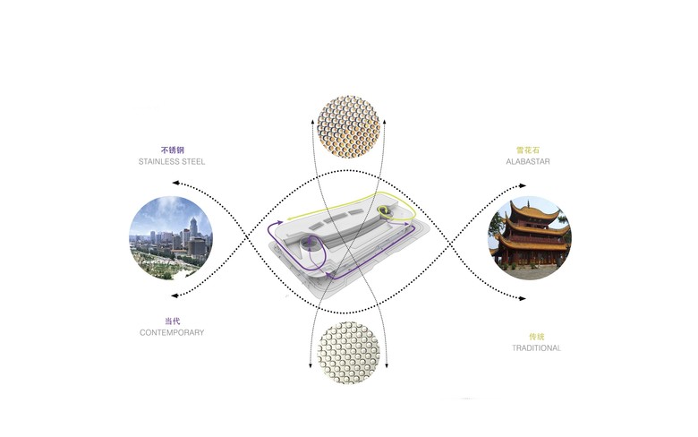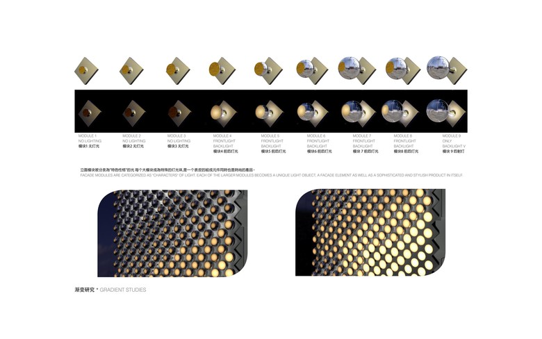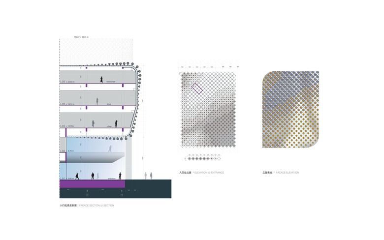 The façade design focuses on achieving a dynamic effect reflecting the handcrafted combination of two materials: polished stainless steel and patterned glass. These two materials are crafted into nine differently shaped, but standardized spheres. Their specific positions in relation to each other recreate the effect of movement and reflection in water, or the sensuous folds of silk fabric.
