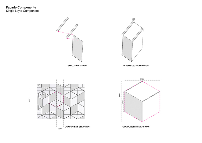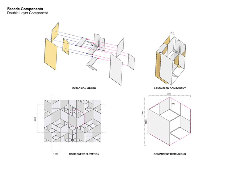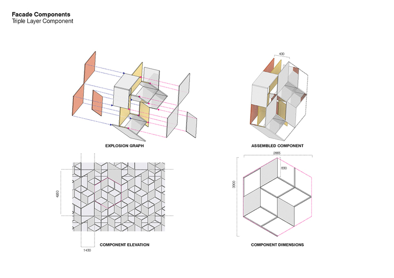 On the lower facade a hexagonal grid consists of diamond shaped panels that are tied between pins forming a tensioned cladding system. Here the arrangement of the components can change across the facade from single layer to triple layer, up to a depth of 400mm. Constructed from different materials and lit by RGB LEDs these panels create different visual effects: transparent or opaque, colourful or monochrome, reflective or matt.
