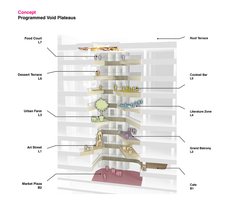 The existing qualities of the immediate urban surroundings, which include small-scale restaurants and boutique stores, are reflected in the building where they are stacked vertically to populate the envelope with programmatic destinations that can be seen from street level.