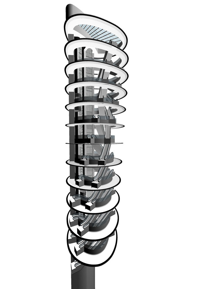 Void – The 12-floor deep void is placed beside the façade, rather than deeper inside the building, in order to facilitate such inside-outside relations. This void forms the main connecting element within the building, with three panorama elevators and two sets of escalators forming the vertical circulation. The void consists of a straight, circular opening which optically appears to slant and twist. This optical effect is generated by the way in which escalators have been positioned inside the atrium space. At each floor level the position of the escalators rotates by ten degrees, resulting in a 110 degree rotation from ground level to the roof.