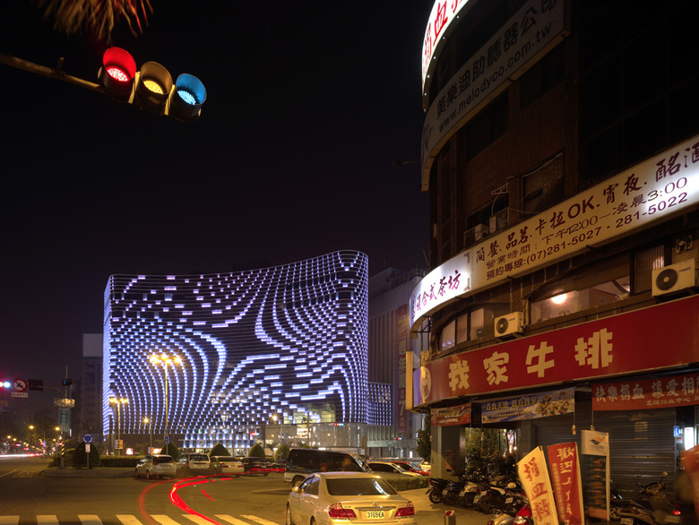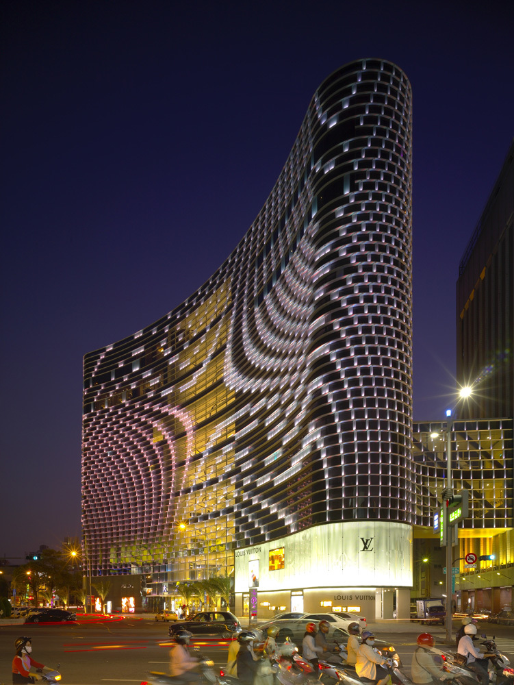 At night, colored lighting replaces the optical effects produced by the depth embedded in the façade motif, with a fluid layer of changing hues and tones. The dots on the laminated glass fins pick up the colors distributed by LED-lights which are integrated at the bases of the fins. The minimized light fittings contribute to the luxurious appearance of the façade. The night-time appearance of the building is important in Taiwan, which has a tradition of late-night shopping and all-night markets.