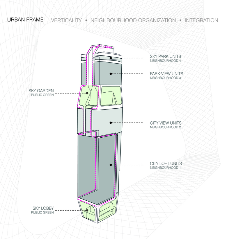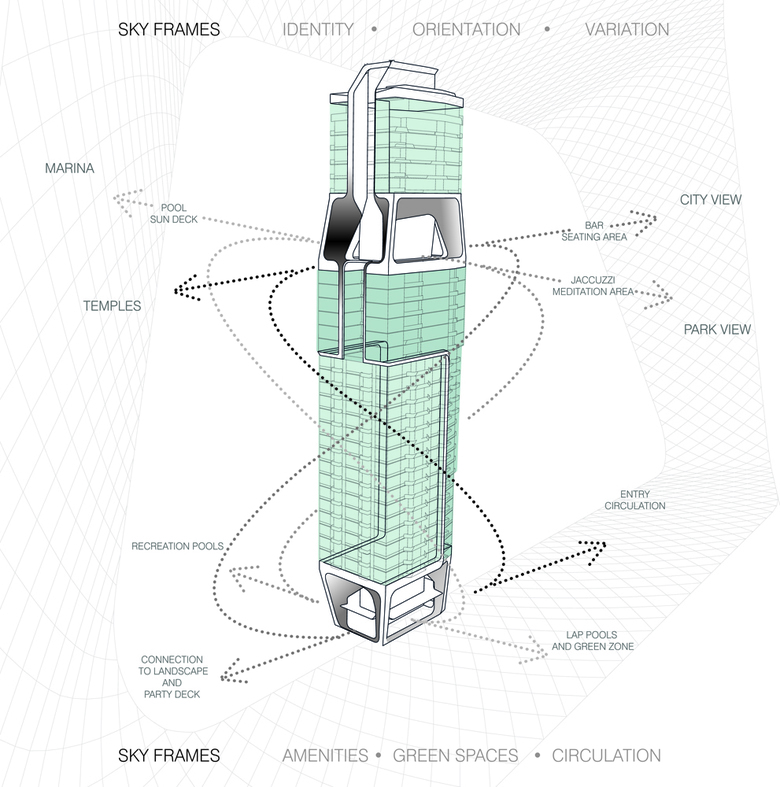 Neighbourhoods in the sky – The concept of The Scotts Tower is that of a vertical city incorporating a variety of residence types and scales. In addition, outdoor green areas in the form of sky terraces, penthouse roof gardens and individual terraces form an important element of the design. The vertical city concept is interpreted on the tower in three scales; the "city", the "neighbourhood" and the "home". The three elements of the vertical city concept along with the green areas are bound together by two gestures: the "vertical frame" and the "sky frames". The vertical frame organises the tower architecturally in an urban manner. The frame affords the tower the vertical city effect by dividing the four residential clusters into different neighbourhoods. The sky frames - at the lobby (Level 1 & Level 2) and sky terrace (Level 25) - organise the amenity spaces and green areas of the tower.