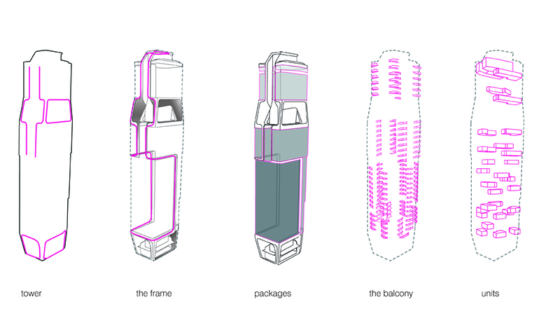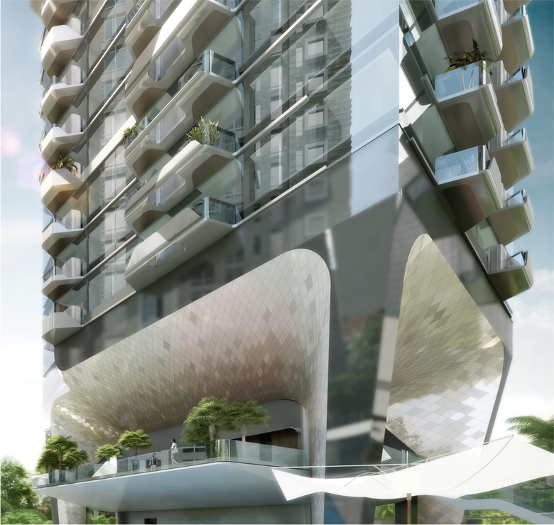 Ben van Berkel: "The balconies combined with the zoning of the individually framed neighbourhoods in The Scotts Tower create different scales of detail in the structure; both intricate, smaller details and larger gestural details. In The Scotts Tower the balconies form part of the interior furniture."