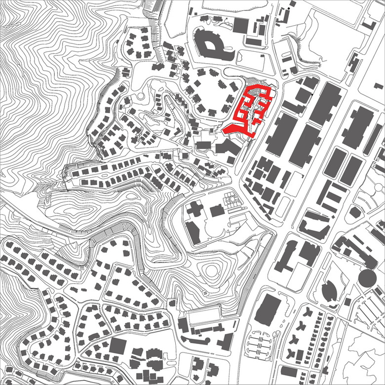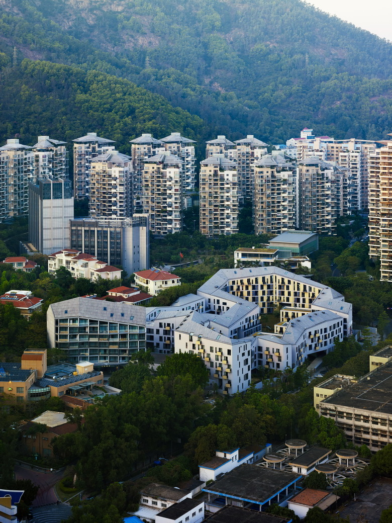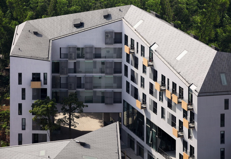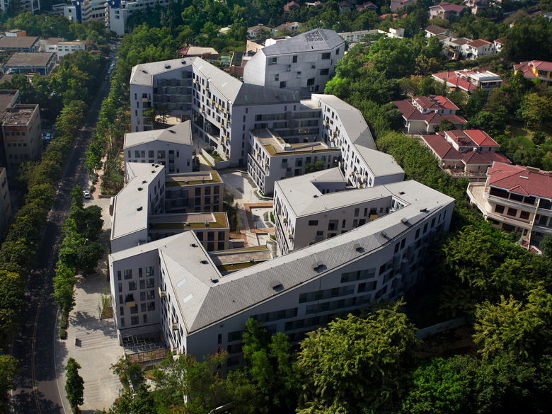 Located at the base of a hillside in Shekou, Shenzhen, the total area of the site is roughly 13,200 square meters, with 25,100 square meters of building area programmed as residential apartments and a hotel.