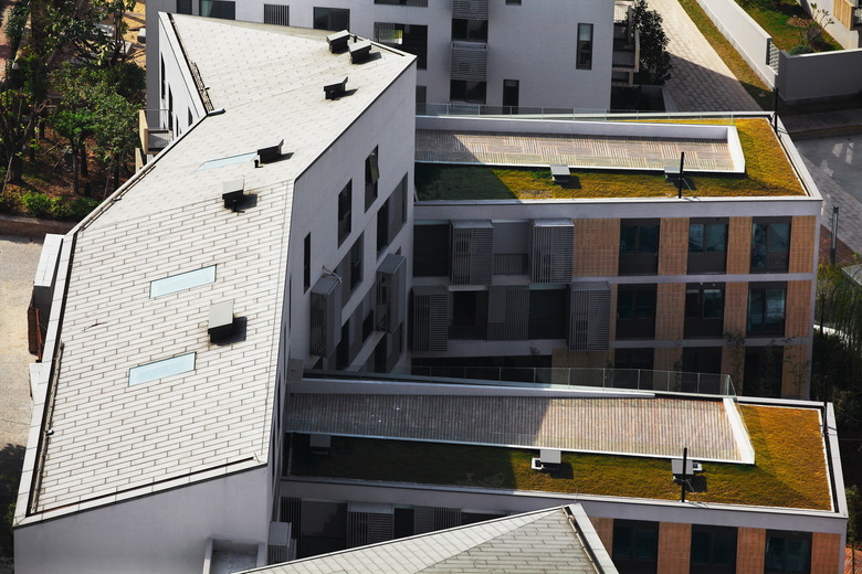 Located on the foot of the mountain which is called “south mountain”, the site is terraced and sloped. The buildings gently grow out from the landscape, taking on the angular characteristic of the geography while offering ponds and courtyards to the residents. Views from the units extend to several smaller courtyards where bamboo, pine, and plum blossom can be found. In the center of the site, a modest walkway forms a link over the water, bridging the interconnected garden.