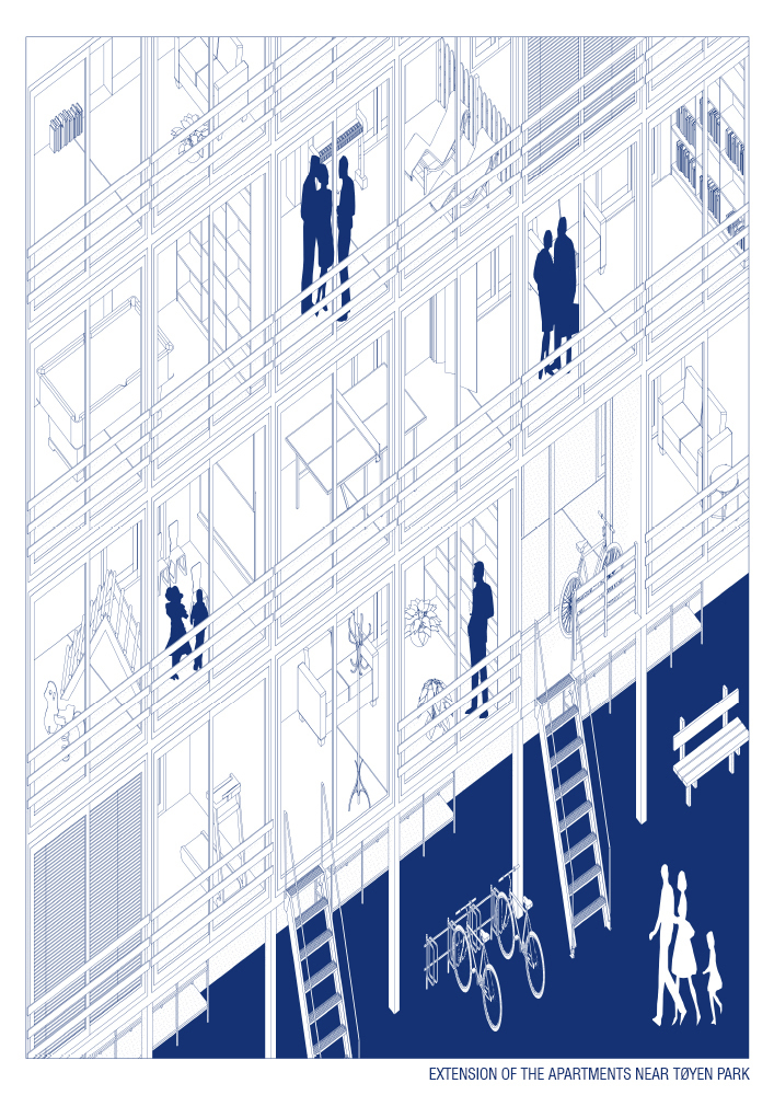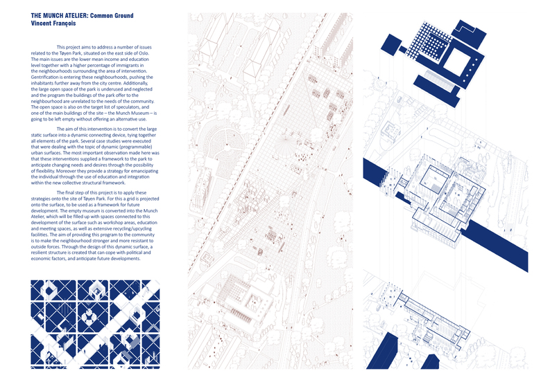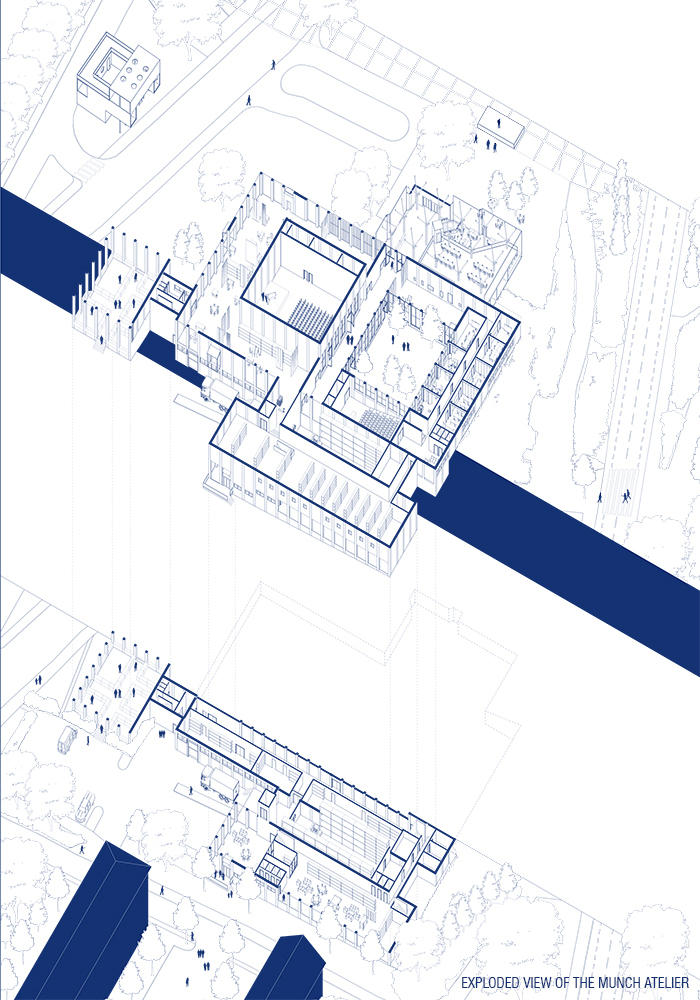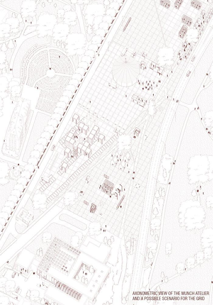 "The conversion of the empty Munch Museum into an atelier for the neighbourhood, which is encouraging the inhabitants to develop the open space in front of the atelier into an emancipative tool. The openness of the park is an obstacle, how can it become a connecting device?"