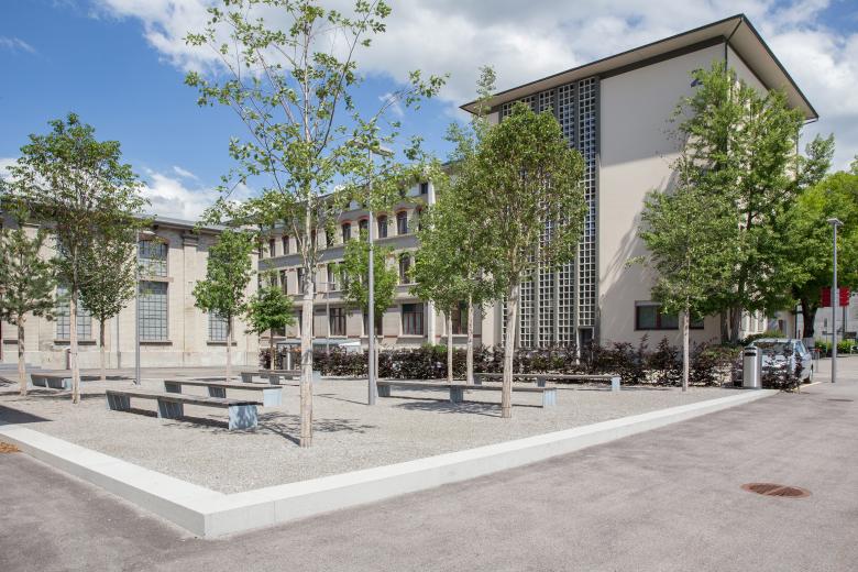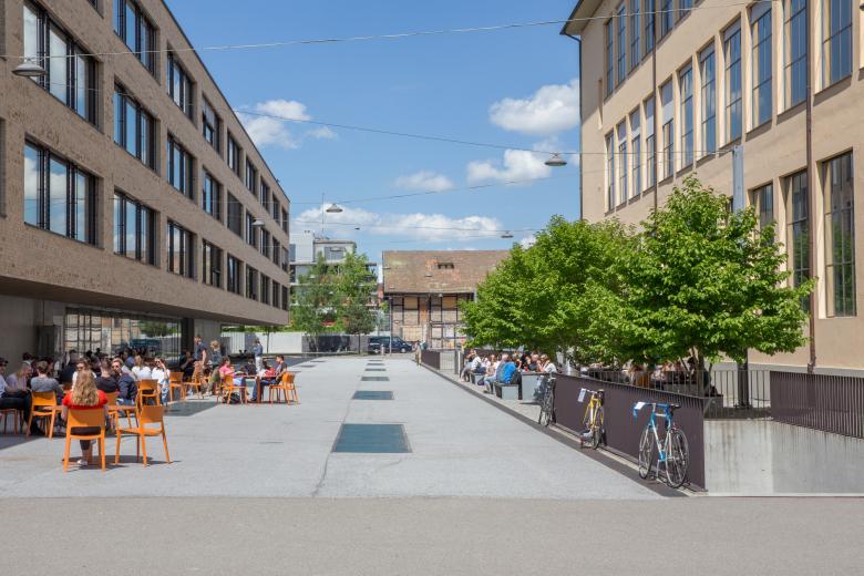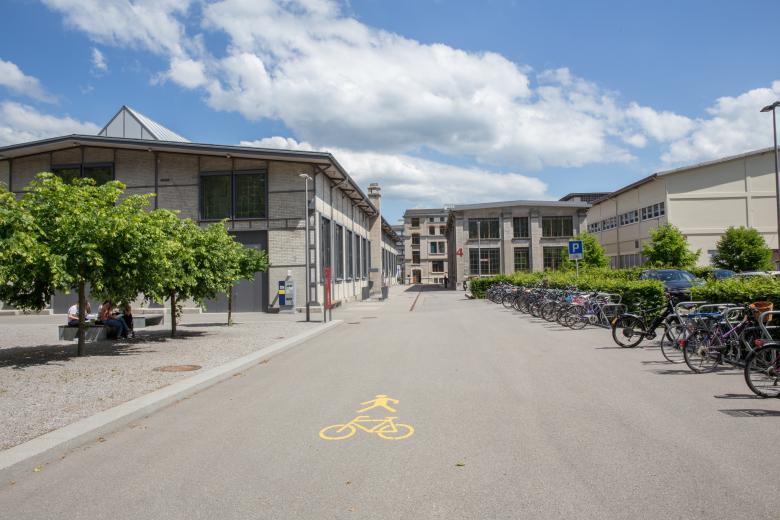 Der neue auf dem von Roll-Areal geplante Gebäudekomplex, wird von vier unterschiedlichen Freiräumen umgeben, die einer klaren Funktion zugeordnet werden und je eine eigene Stimmung aufweisen. Ein Asphaltbelag umspannt wie ein Teppich den Hauptbau und fügt die angrenzenden Bauten zu einem Ganzen zusammen. Die Platzentwässerung, die Aussenbeleuchtung und teilweise das Mobiliar sind jeweils in der Mitte der lang gezogenen Aussenräume angeordnet. Ein Dach aus einheimischen und teilweise seltenen Baumarten, die auch bei der Ausbildung der Studenten der pädagogischen Hochschule zum Gegenstand werden, ist Aufenthalts- und Rückzugsort zum Verweilen und Lernen. Die unmöblierte Hauptplatzfläche hebt sich von der umliegenden Umgebung durch die in den Belag eingelassenen Oblichter der darunterliegenden Veloeinstellhalle und der Mensa ab. Nachts bildet hier eine abgehängte und zufällig angeordnete Beleuchtung eine besondere räumliche Qualität. Eine edle, gartenkulturell wertvolle Magnolienpflanzung steht entlang des Hauptplatzes auf der lang gezogenen, möblierten Chaussierung und dient als schattiger Aufenthaltsort.