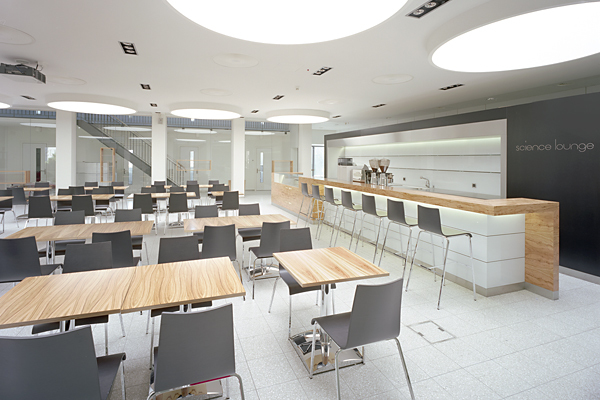 The laboratory and office building was given a refreshing face lift and structurally adapted as necessary. In the seventh floor cafeteria was established, with an Italian coffee bar being the main attraction. The hall serves both the Board and the gathering for projection events. The furniture in accordance was kept light and flexible for different uses. One floor down an order office has been established with a customer and a work area. To separate the two areas, a bar was installed. In the remaining floor works, laboratories and clean rooms were installed. Thus the ETH receives its own access into the building, the facade was broken and a vestibule entrance was set up. In this new main entrance forecourt with plant discounts, lighting, a bike park and a sign for the ETH originated. Total investment: 26 Mil CHF.