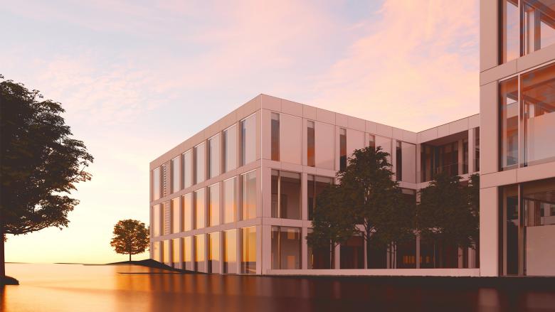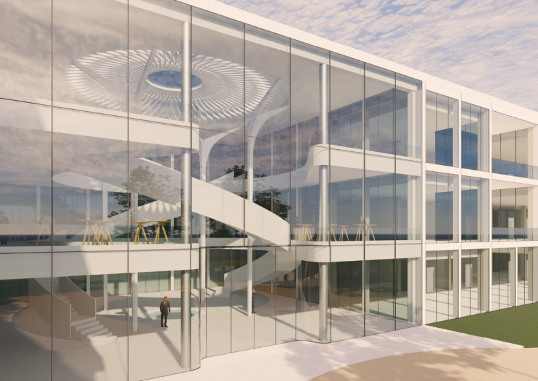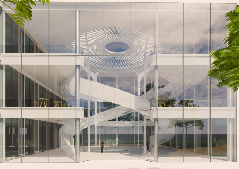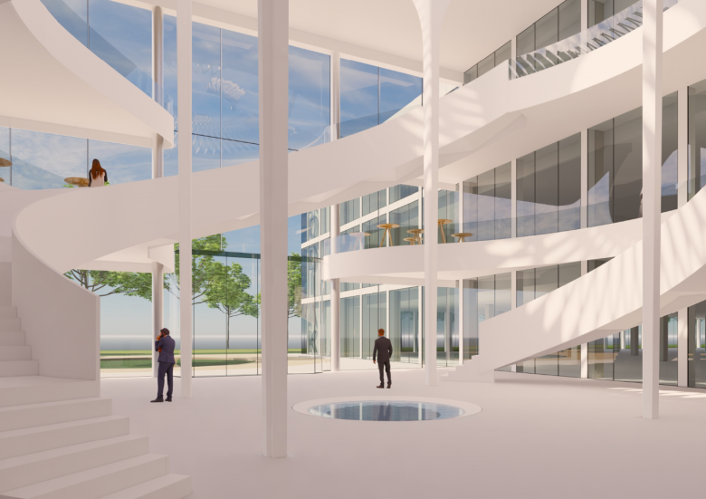 Die Labore, Verwaltung sowie der Co-Working Bereich richten sich zu einem gedeckten Atrium und geöffneten Innenhof zum grossen Park, über welchen gepflegte Fahrrad- und Fusswege, das Gebäude mit der Stadt, dem Bahnhof und den öffentlichen Bereichen verbindet.
