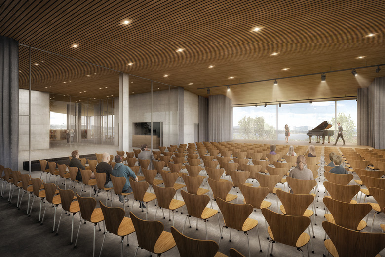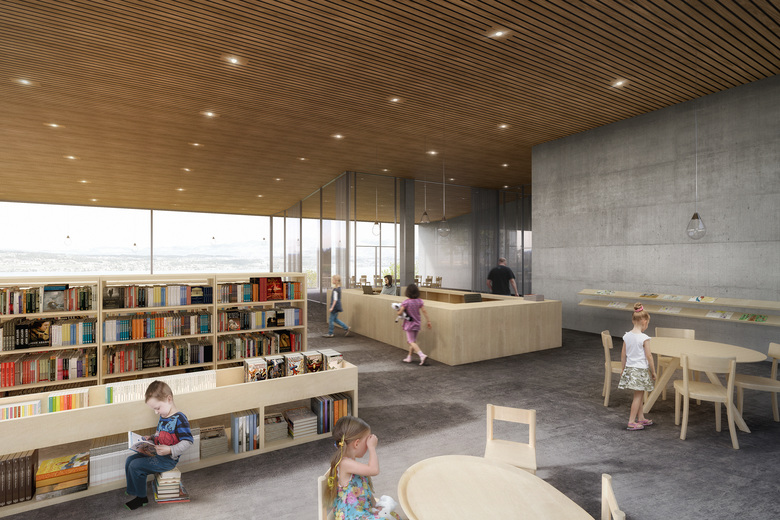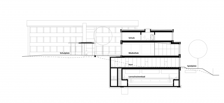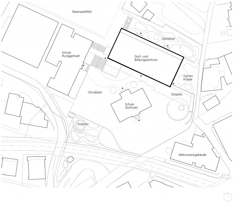 Dorf- und Pausenplatz. Aula, Saal, Bibliothek/Mediathek, 5 Klassenzimmer, Gruppenräume, Schulverwaltung, Hort, Krippe, Schulschwimmanlage. Minergiestandard.