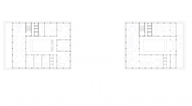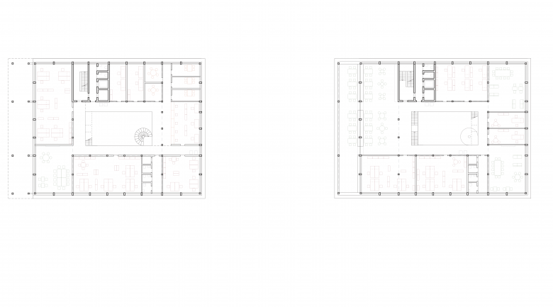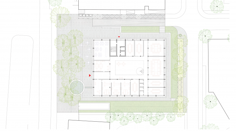 - Eingangsbereich, Café, Zentrale Sitzungszimmer, Sozialbereich, Büros, Cafeteria, Drittnutzung,