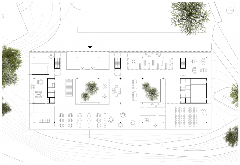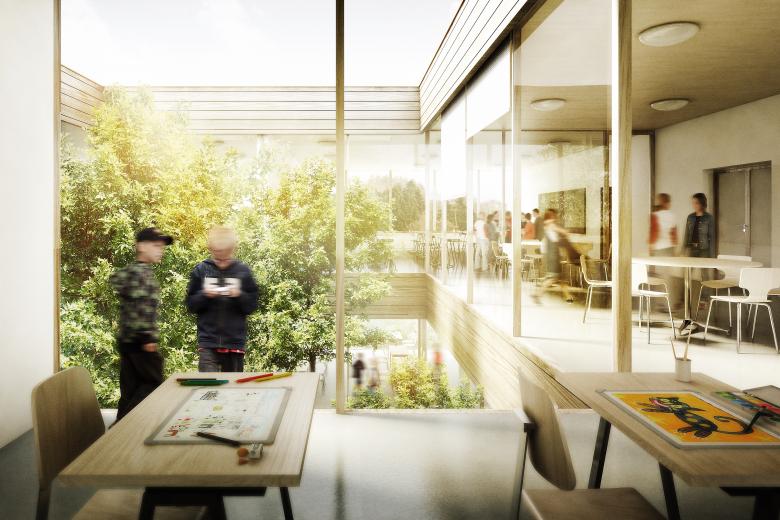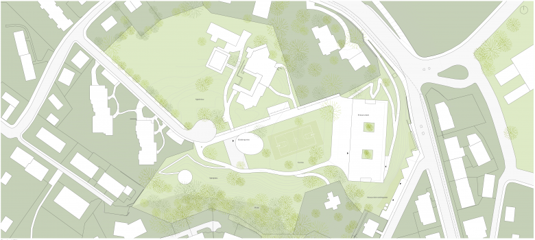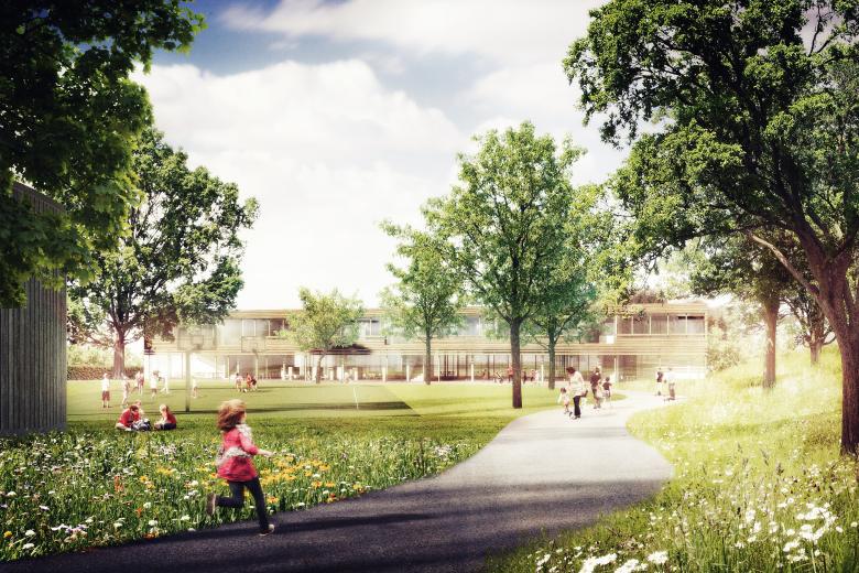 - Neubau mit 12 Klassenzimmern als Tagesschule, Bibliothek / Mediathek, Mensa, Mehrzweckraum / Aula, Doppelturnhalle, Kindergarten, Pausen- und Sportplätze