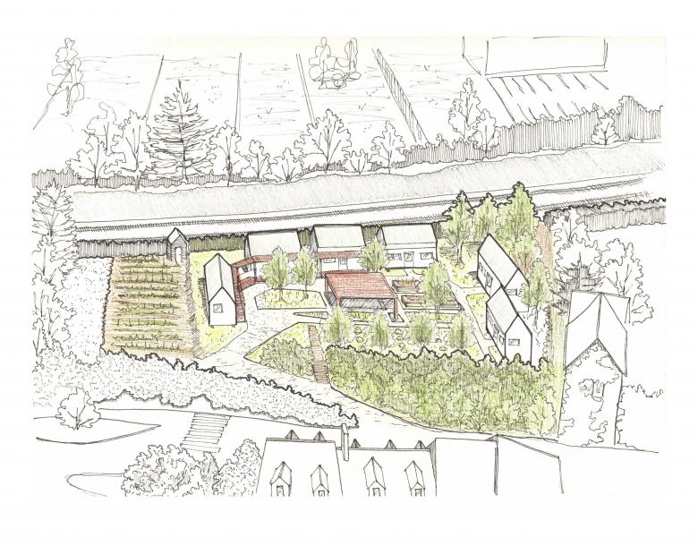Besondere Aufmerksamkeit gilt der Ausrichtung der Gebäude, der Qualität der Aussenräume sowie der klaren Organisation der Beziehungen zwischen Bewohner:innen und Nachbarschaft. Zentrales Element des Projekts ist ein pflegeleichter Nutzgarten, der teilweise auf permakulturellen Prinzipien basiert und sowohl der Selbstversorgung als auch dem sozialen Austausch dient.