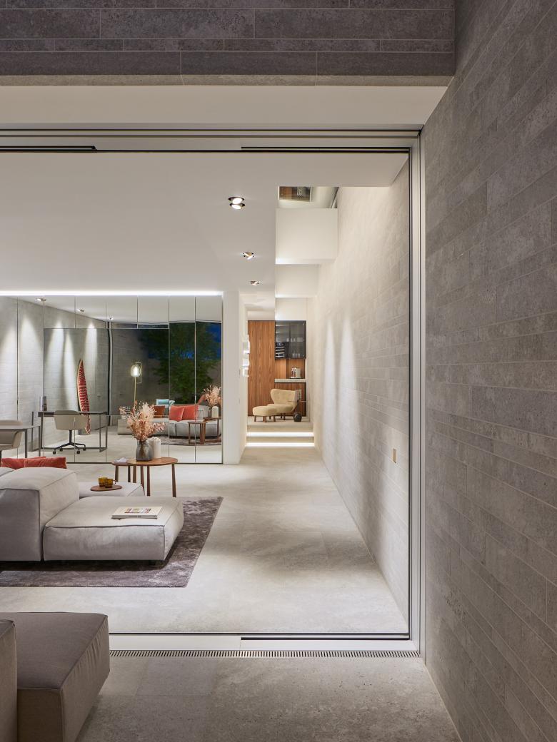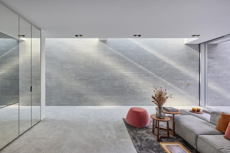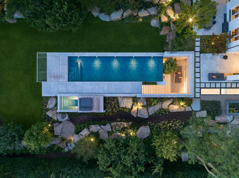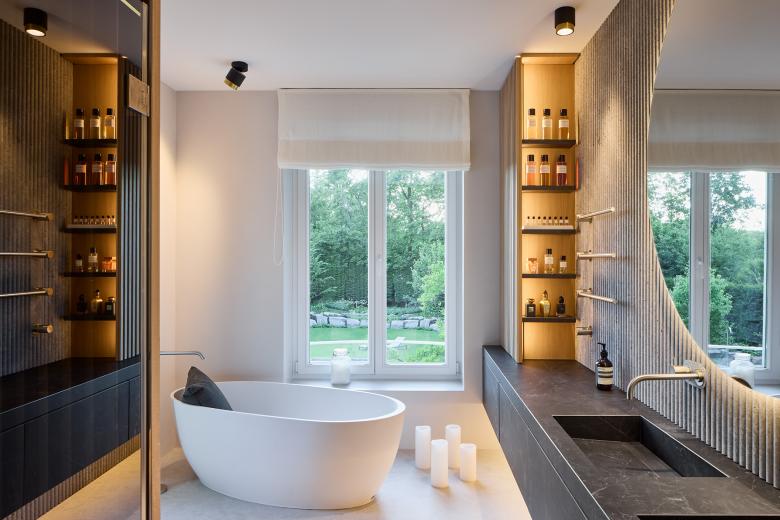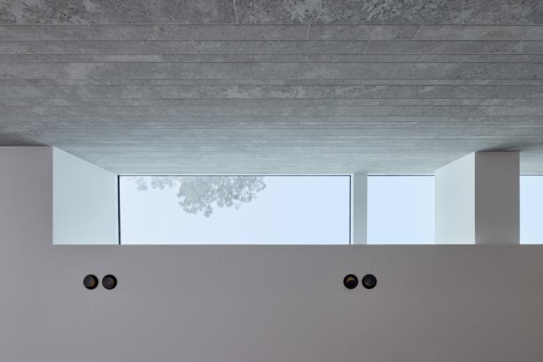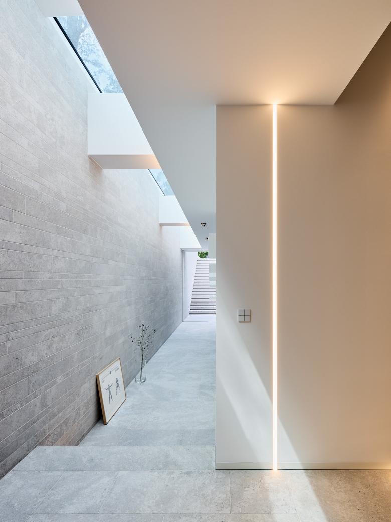 Die ehemals als Offiziershaus genutzte, denkmalgeschützte Villa wird in mehreren Schritten umgestaltet und durch eine untergeschossige Erweiterung vergrößert. In diesem Zusammenhang entsteht ein zurückhaltendes Ensemble aus Haupthaus, Erweiterung mit Lichthof und einer langgestreckten Infinity Poolanlage auf dem parkähnlichen Grundstück. An den Lichthof grenzt eine Lounge die sich über eine Pockettür komplett nach Aussen öffnen lässt. So verschwimmen die Grenzen zwischen Innen und Aussen und es entsteht ein spannender Raum. Die Aussenwände des Lichthofs und der Lounge sind mit Muschelkalk bekleidet. Das Material zieht sich ebenfalls von Innen nach Aussen und verstärkt somit nochmals den Charakter der Innen und Aussenbeziehung der Räume.