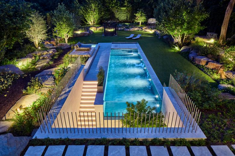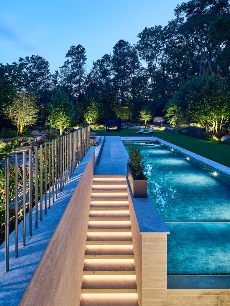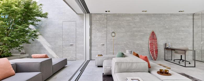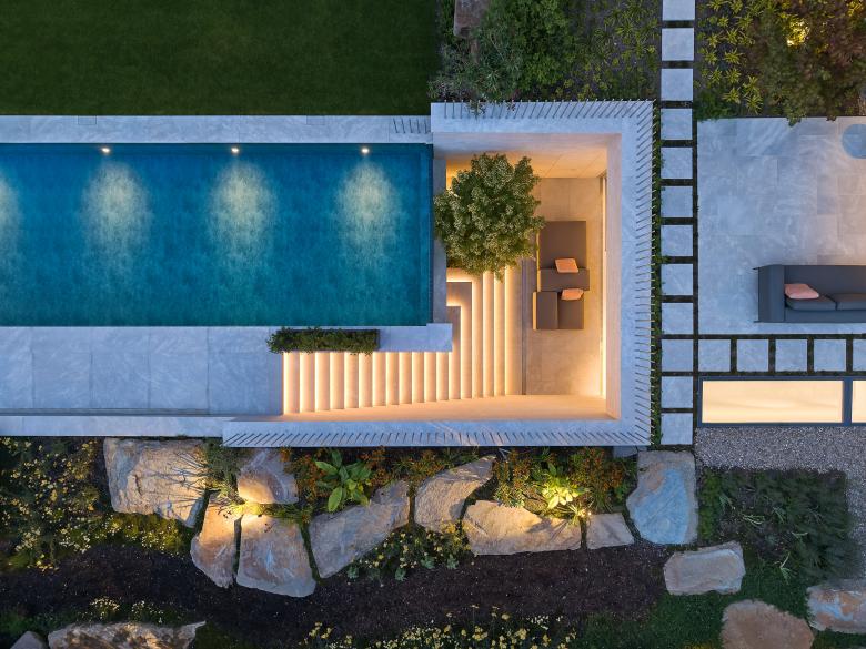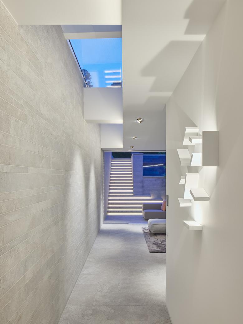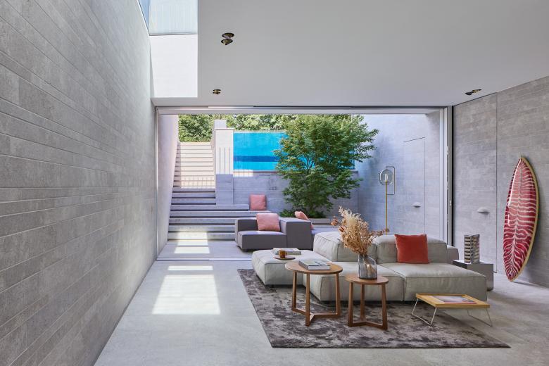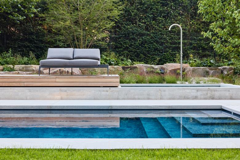Die ehemals als Offiziershaus genutzte, denkmalgeschützte Villa wird in mehreren Schritten umgestaltet und durch eine untergeschossige Erweiterung vergrößert. In diesem Zusammenhang entsteht ein zurückhaltendes Ensemble aus Haupthaus, Erweiterung mit Lichthof und einer langgestreckten Infinity Poolanlage auf dem parkähnlichen Grundstück. An den Lichthof grenzt eine Lounge die sich über eine Pockettür komplett nach Aussen öffnen lässt. So verschwimmen die Grenzen zwischen Innen und Aussen und es entsteht ein spannender Raum. Die Aussenwände des Lichthofs und der Lounge sind mit Muschelkalk bekleidet. Das Material zieht sich ebenfalls von Innen nach Aussen und verstärkt somit nochmals den Charakter der Innen und Aussenbeziehung der Räume.