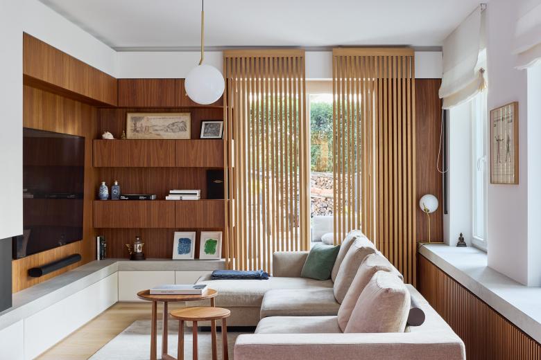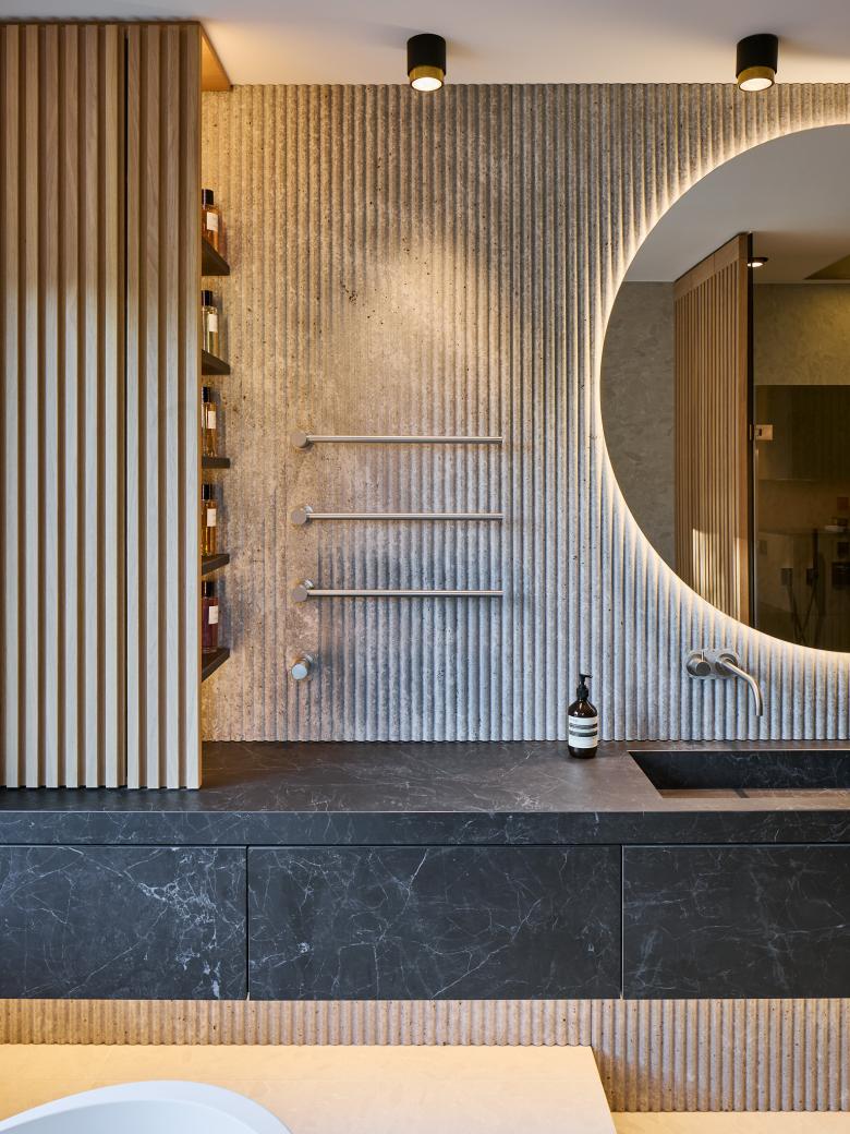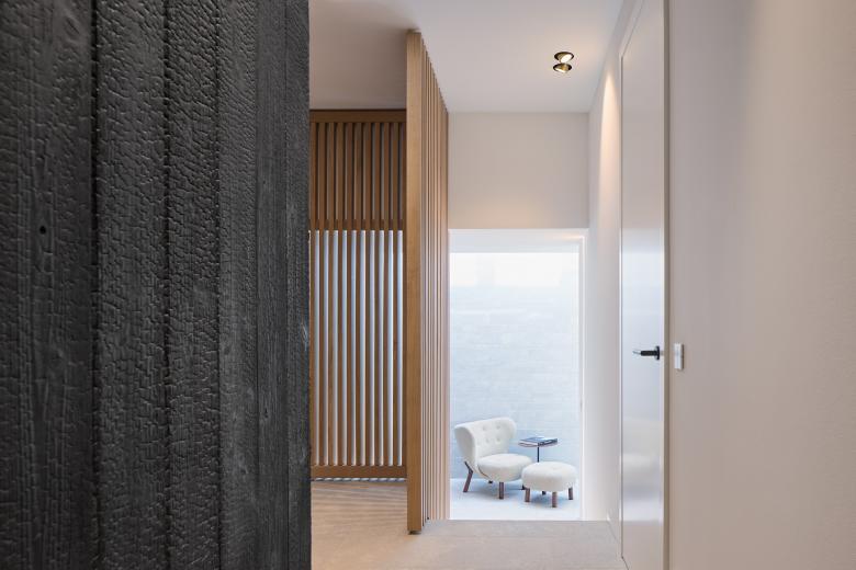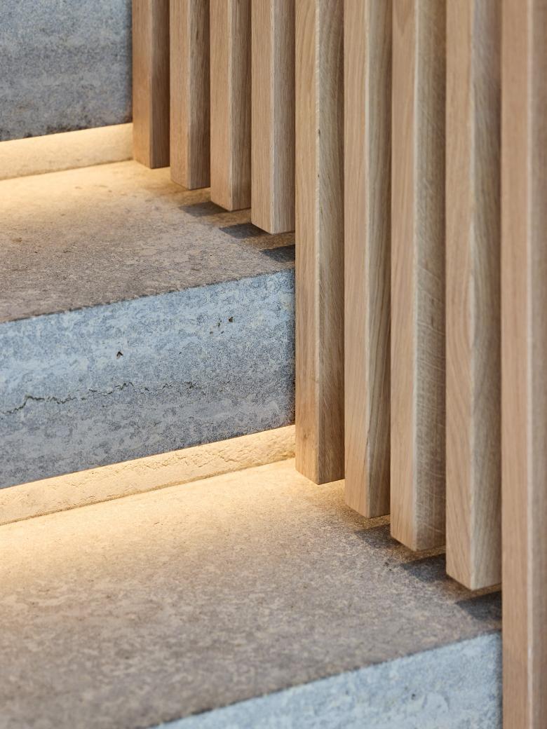Im Altbau ziehen wenige, zurückhaltende, natürliche Materialien ein und schaffen ein zurückhaltendes Inneres. Lichttechnisch dominieren indirekte Beleuchtungsarten die die Räume in atmosphärische Stimmungen tauchen.