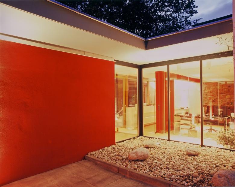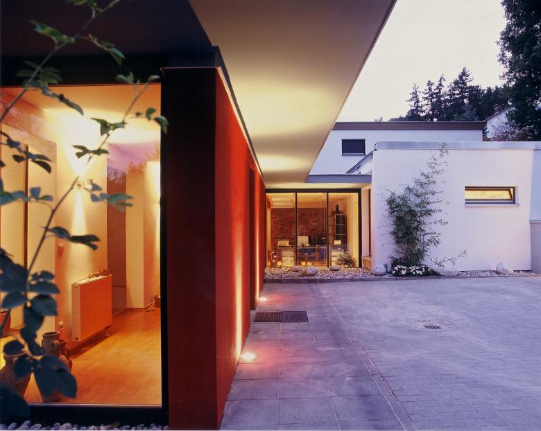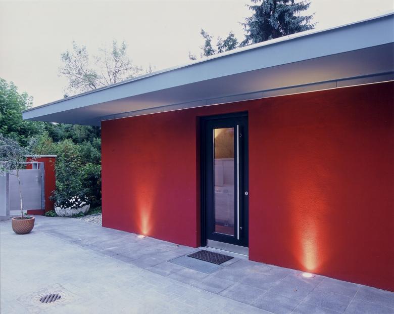 Das Resultat ist ein zeitloses Ensemble, das dezent im Hintergrund bleibt und die beiden Baukörper in den Vordergrund rückt. Die Verbindung des Ensembles wird durch eine markante rote Wandscheibe betont, die wir mit dem Bauherrn gemeinsam entschieden haben – ein klares Zeichen der Abstimmung zwischen Bestand und Erweiterung.
