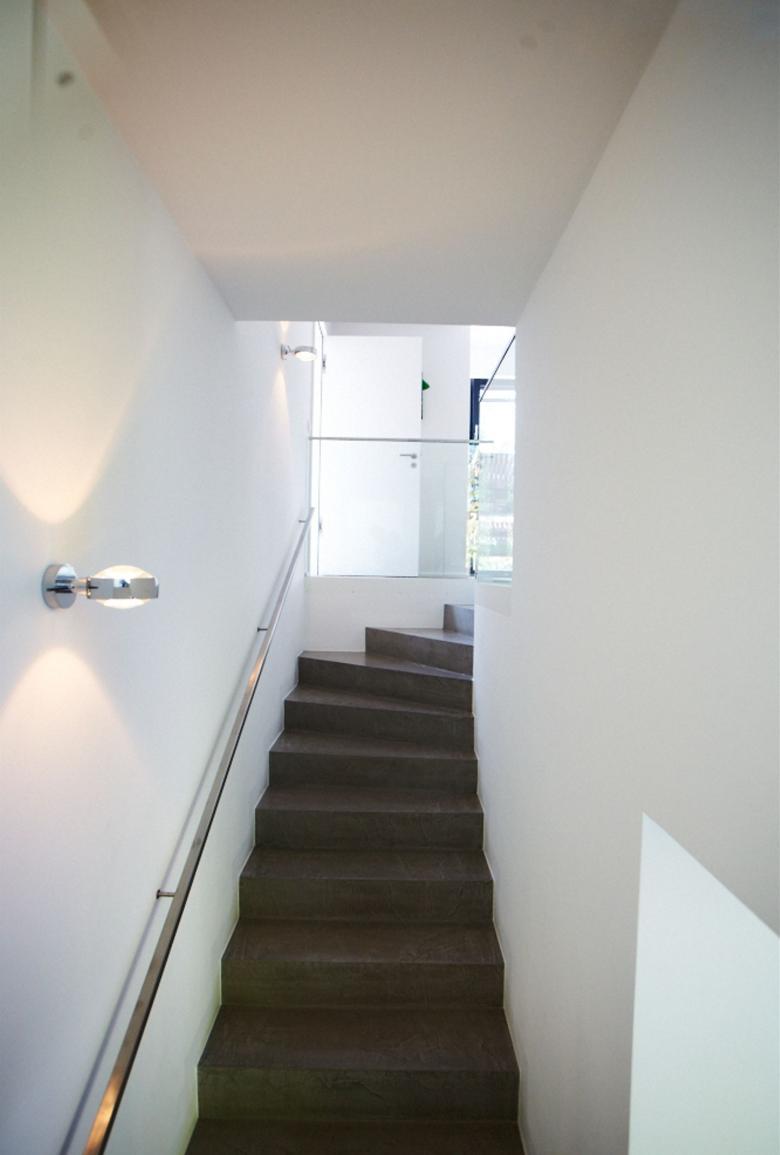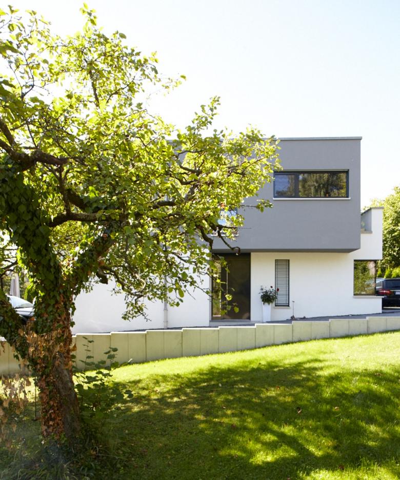 Die Grundidee für den Baukörper entwickelten wir von innen heraus, weil nur eine begrenzte Grundfläche zur Verfügung stand. Das Ergebnis ist ein verschachtelter Baukörper, der zweifarbig gestaltet wurde, um so viel Licht wie möglich ins Innere zu holen und gleichzeitig geringe Einblicke von außen zu gewähren. Die Hanglage stellte eine besondere Herausforderung für die Bebaubarkeit nach B-Plan dar, da das Kellergeschoss kein Voll- oder Gartengeschoss werden durfte.