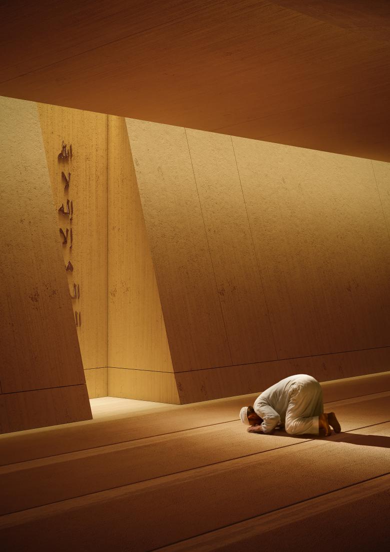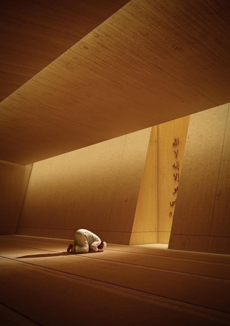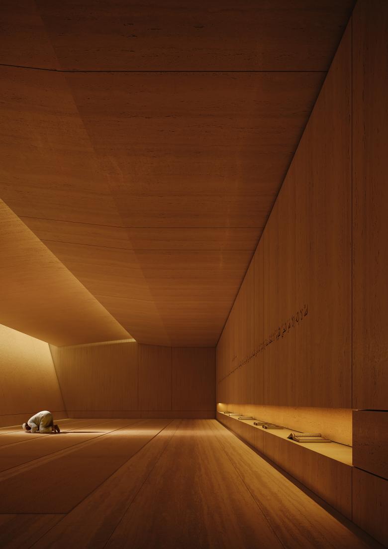 The client—a Saudi Arabian prince—commissioned YODEZEEN to design a contemporary mosque as part of a larger 12,000 m² private complex in Riyadh. While the mosque would primarily serve the estate, it was also intended to be accessible to the public, as it faces a main road. The brief called for a design that respects the sacred spatial principles of Islamic architecture while reflecting YODEZEEN’s modern, sculptural aesthetic. The goal was to merge timeless spirituality with elevated materiality and thoughtful form.