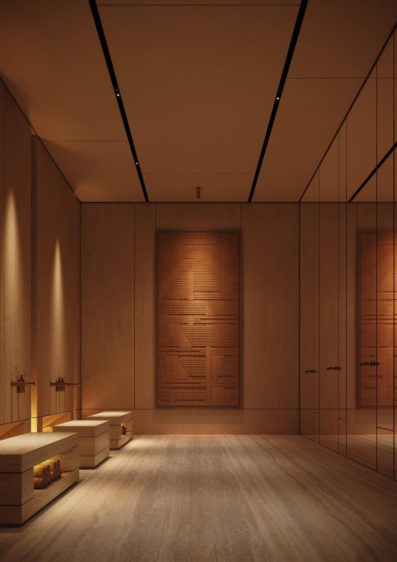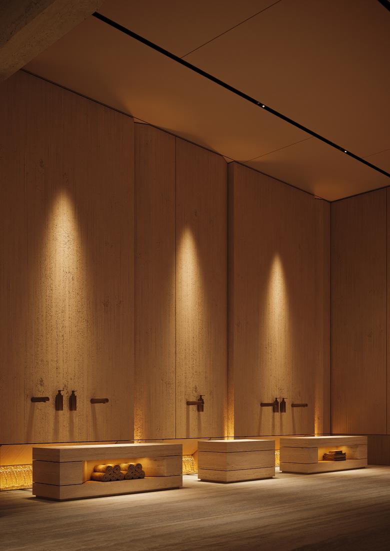 We conducted in-depth research into Islamic architectural typologies to ensure full respect for spiritual and functional requirements, including orientation, circulation, and rituals. The mosque’s clean geometry is built from the world’s finest materials, including Italian travertine and decorative fluted plaster, with natural wool carpets chosen to comply with religious norms. A separate ablution space (wudu) was planned across the street, easily accessible through a public passage. The design features custom wall art and a serene yet powerful interior atmosphere. Accessibility was integrated from the outset, ensuring inclusive worship for all.