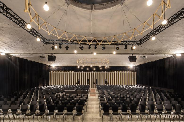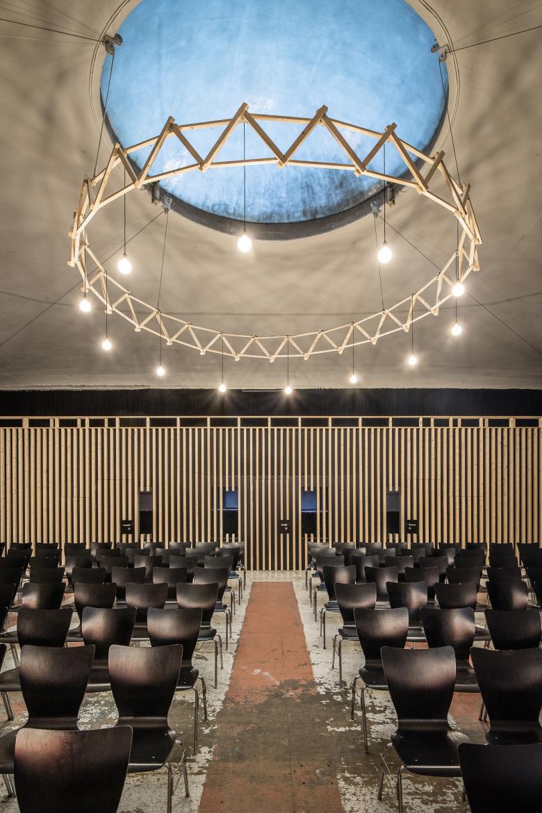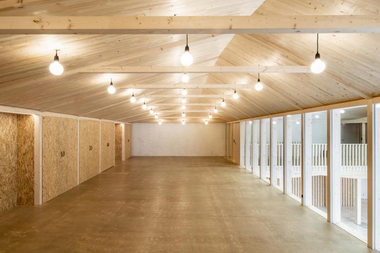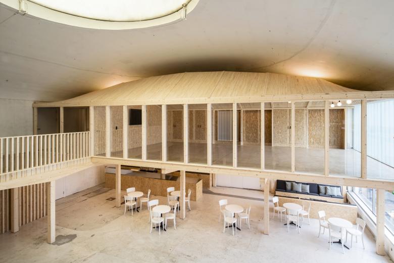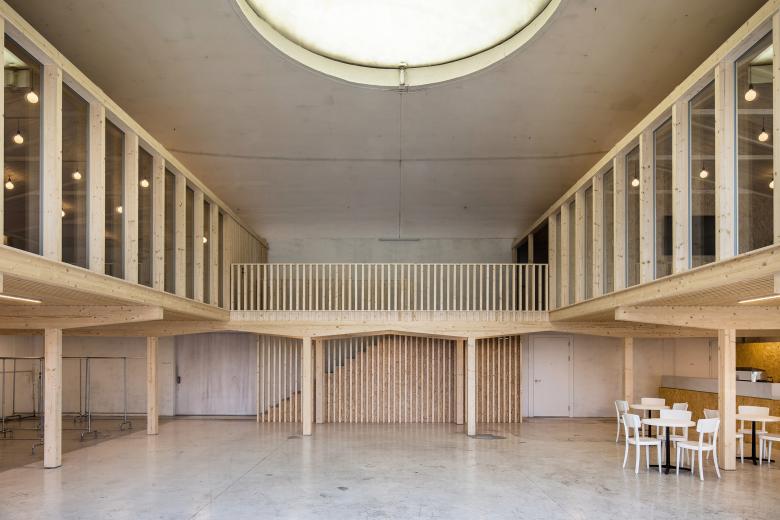 Der Industriecharakter der Hallen wird erhalten. Neue Einbauten werden in industrieller Qualität gefertigt. Aus Holz kontrastieren sie mit dem bestehenden Beton und bringen trotz roher Oberflächen Wärme in die Hallen. Die Decken der nutzungsneutralen Räume im Obergeschoss schmiegen sich, ebenfalls gewölbt und aus industriellem Massivholz gebaut, unter Islers Betonschalen und bergen trotz geringer Raumhöhen grosszügige und lichte Räume.