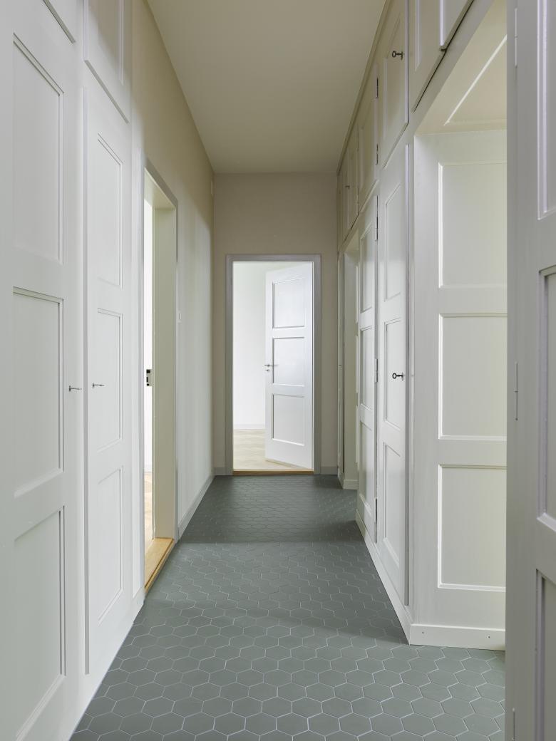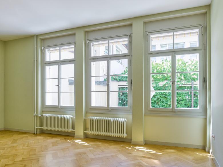 An der Marktgasse – mit den berühmten Lauben der Berner Altstadt – steht dieses 1933 erbaute Wohn-, Büro- und Geschäftshaus. Wir erneuerten die Liegenschaft in Etappen von 2018 bis Ende 2022 nach einem sorgfältigen Denkmalpflegekonzept, in sehr guter Zusammenarbeit mit der städtischen Denkmalpflege. Die bauzeitlichen Fenster mit raffinierten Beschlägen wurden restauriert und energetisch und schalltechnisch aufgewertet. Wo die historischen Oberflächen verloren gegangen sind, wurden sie anhand von Stratigrafien rekonstruiert. Feine Flies-Tapeten, Holzwerk mit Ölfarbenanstrich und (meist bauzeitliche) Eichenholz-Bodenbeläge prägen die Raumstimmung.