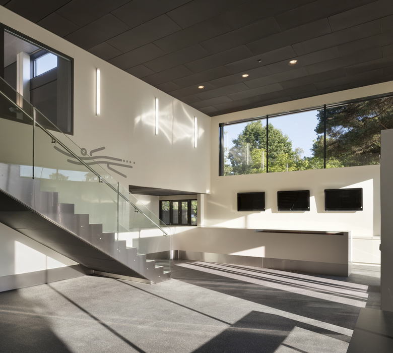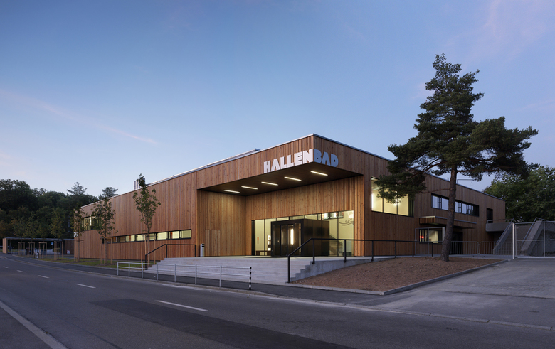 Die zweigeschossige Eingangshalle verbindet den Zugangsbereich mit dem Niveau der Garderoben und des Hallenbades. Durch Sichtbezüge werden Haupt- und Nebennutzung interessant miteinander verbunden.