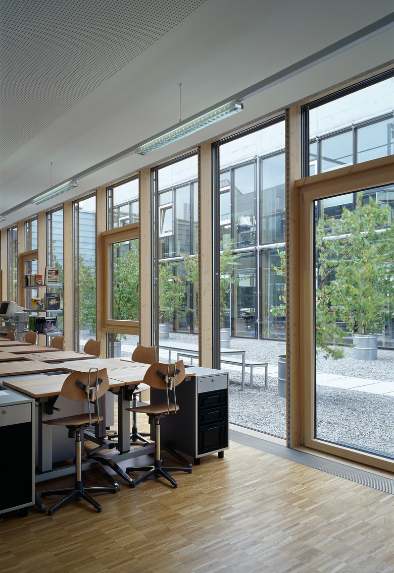 Zwei langgezogene Bauvolumen mit den Spezialräumen umfassen das Herzstück des Schulgebäudes – die mit Innenhöfen alternierenden Klassenzimmerquerbauten. Alle Klassenzimmer weisen auf beiden Längsseiten verglaste Fronten auf. So sind alle Räume mit natürlichem Licht bestmöglich ausgeleuchtet, was für die Benutzer im Gebrauch ein Maximum an Freiheiten hinsichtlich Gestaltung und Nutzungsflexibilität offen lässt. Zusätzlich verfügt jedes Klassenzimmer über einen privaten Aussenraum im angrenzenden Innenhof oder auf dem Dach des Klassentraktes, der individuell genutzt und gestaltet werden kann.
