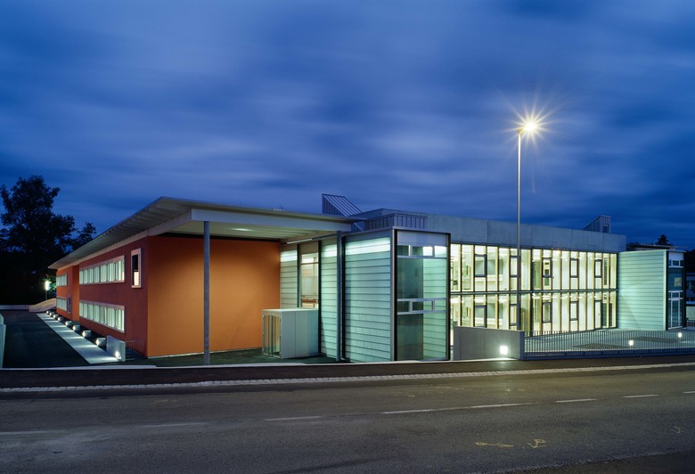 Die Bauten werden bewusst niedrig gehalten und in das Terrain eingebettet. Der Schulraumtrakt übernimmt die Bebauungsstruktur der Ebene, die Aula, sowie die in der zweiten Etappe vorgesehene Turnhalle mit dem Rasenspielfeld, gliedern sich in die Struktur des Grentscheltals ein.