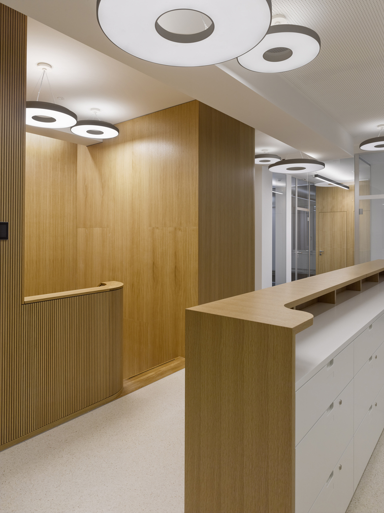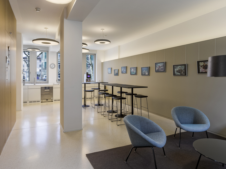 Mit dem Umbau konnten die Grundrisse befreit und neuorganisiert werden. Um eine durch sämtliche Geschosse verlaufende Kernzone, mit Nebenräumen, entstanden der Fassade entlang grosszügige, fliessende Räume. Ein übergeordnetes Farbkonzept sorgt für ein zeitgemässes Ambiente und für das Miteinander der denkmalgeschützten Substanz und des Neuen. Der Kern wird identitätsstiftend und schallabsorbierend in Eiche materialisiert. Während die Arbeitsplätze und Sitzungsbereiche auf einer dunklen Teppichfläche ruhen, sind die öffentlicheren Bereiche wie Empfang, Lounge und Cafeteria auf einer hellen Fläche aus Terrazzo organisiert. Helle Wandflächen und gezielte farbige Akzente sorgen für ein zeitgemässes Arbeitsumfeld. Die Haustechnik wird auf den neusten Stand gebracht und mit einer Photovoltaikanlage ergänzt. Die gewählte Baustellenorganisation sorgt für eine konzentrierte Umbauphase und verkürzt die Zeit im Provisorium.