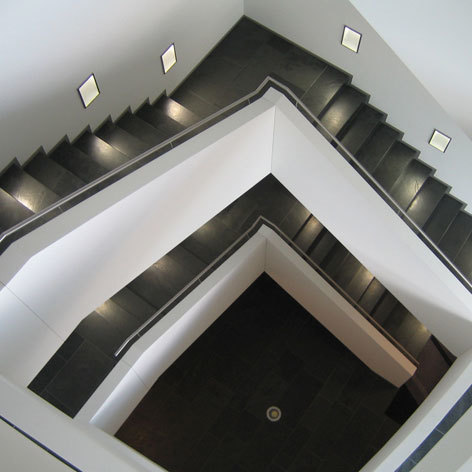 Der t-förmige Gebäudekomplex resultiert aus den Vorgaben des Bebauungsplanes. Die beiden straßenbegleitenden Baukörper folgen mit ihrem Versprung der Baulinie und bilden im Erdgeschoss eine überdeckte Rampe, die von der U-Bahn kommend zum Haupteingang führt.