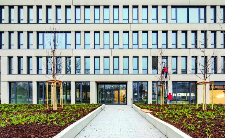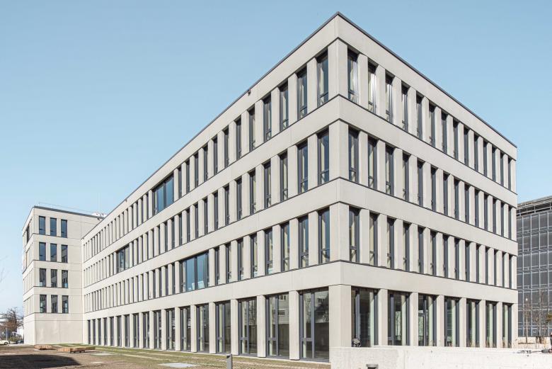 Die Fassade besteht aus vorgehängten, oberflächenveredelten Betonfertigteilen, die jeweils in der Ebene der Geschoßdecken als durchgehende Bänder ausgebildet sind. Dazwischen sind geschosshohe, senkrechte Fertigteile mit unterschiedlichen Leibungstiefen und in unterschiedlicher Drehung zur Fassadenebene eingestellt, sodass sich eine wellenartige Bewegung über die gesamte Fassadenlänge ergibt.