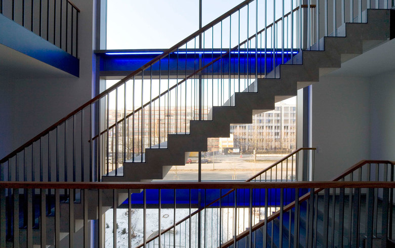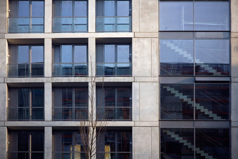 Die Straßenseite erhält die Sichtbetonqualität, auf der Hofseite zur Brüsseler Straße mit den Terrassen, Garten- und Spielflächen sind alle massiven Bauteile weiß gestrichen.
