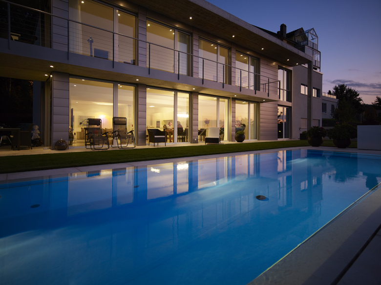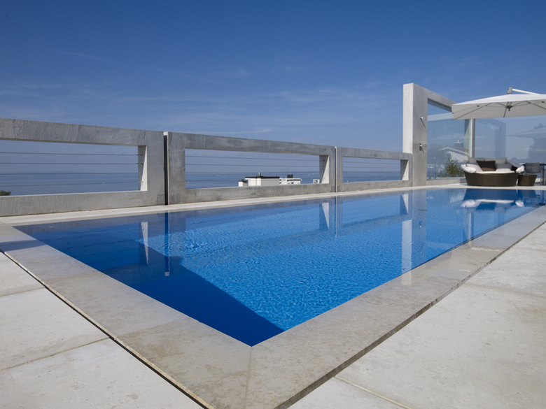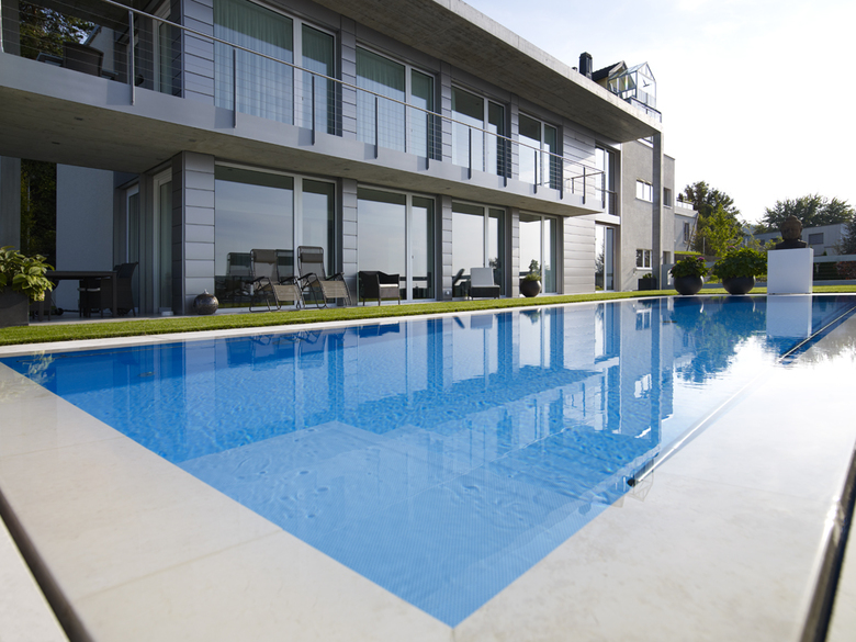 Schwimmbadabdeckung – Heutzutage haben viele Schwimmbäder eine Abdeckung. Eine Poolabdeckung schützt das Schwimmbecken vor Verunreinigungen und sorgt dafür, dass sich das Wasser weniger schnell abkühlt. Bei diesem Objekt wurde eine moderne Rollladenabdeckung aus PVC-solar eingesetzt, welche das Wasser zusätzlich erwärmt.