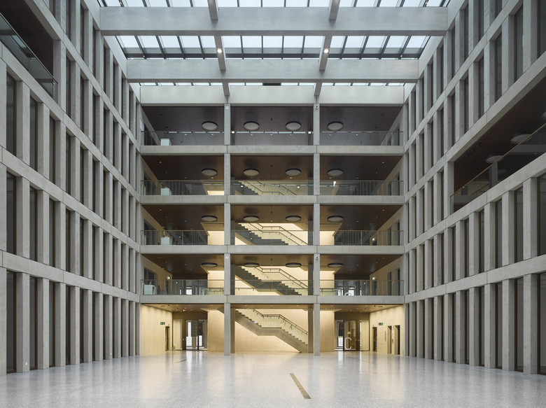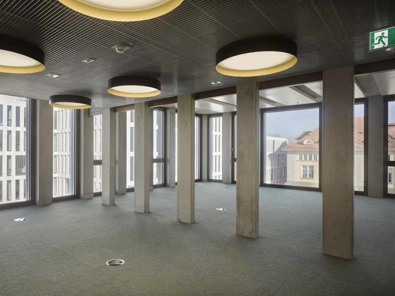 Im Innern der Gebäude bilden überdeckte Atrien die Fortsetzung des polyzentrischen Systems von Bewegungs-, Begegnungs- und Aufenthaltsräumen. Von deren identitätsstiftendem Charakter profitieren auch die Büroflächen, welche ihrerseits grösstmöglicher Flexibilität und Nutzerneutralität verpflichtet sind.