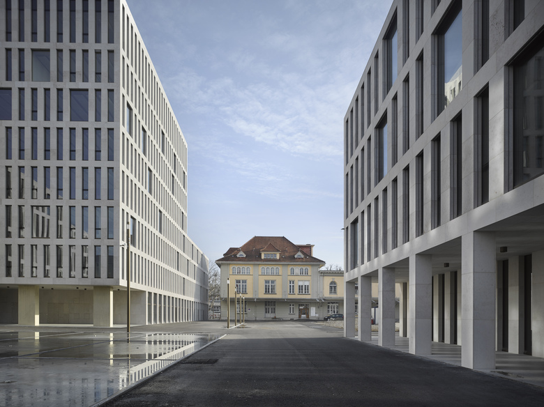 Der Baustein folgt den Prinzipien der traditionellerweise am nördlichen Stadtrand von Bern liegenden Militäranlagen. Diese werden als grossmassstäbliche Anlagen wahrgenommen, bestehen jedoch aus einer Komposition einzelner Volumen, die hochwertige Zwischenräume entstehen lassen. Auf diese Weise bildet das Verwaltungszentrum ein durchlässiges Quartier, dessen Einzelteile sich nach aussen an den bestehenden Strassen- und Gebäudefluchten orientieren, nach innen aber ein vielseitiges System von Freiräumen aufspannen. Die auf dem Areal vorhandenen, zu erhaltenden Bauten werden dabei von den neu zu errichtenden ganz selbstverständlich in dieses Konglomerat eingebunden.