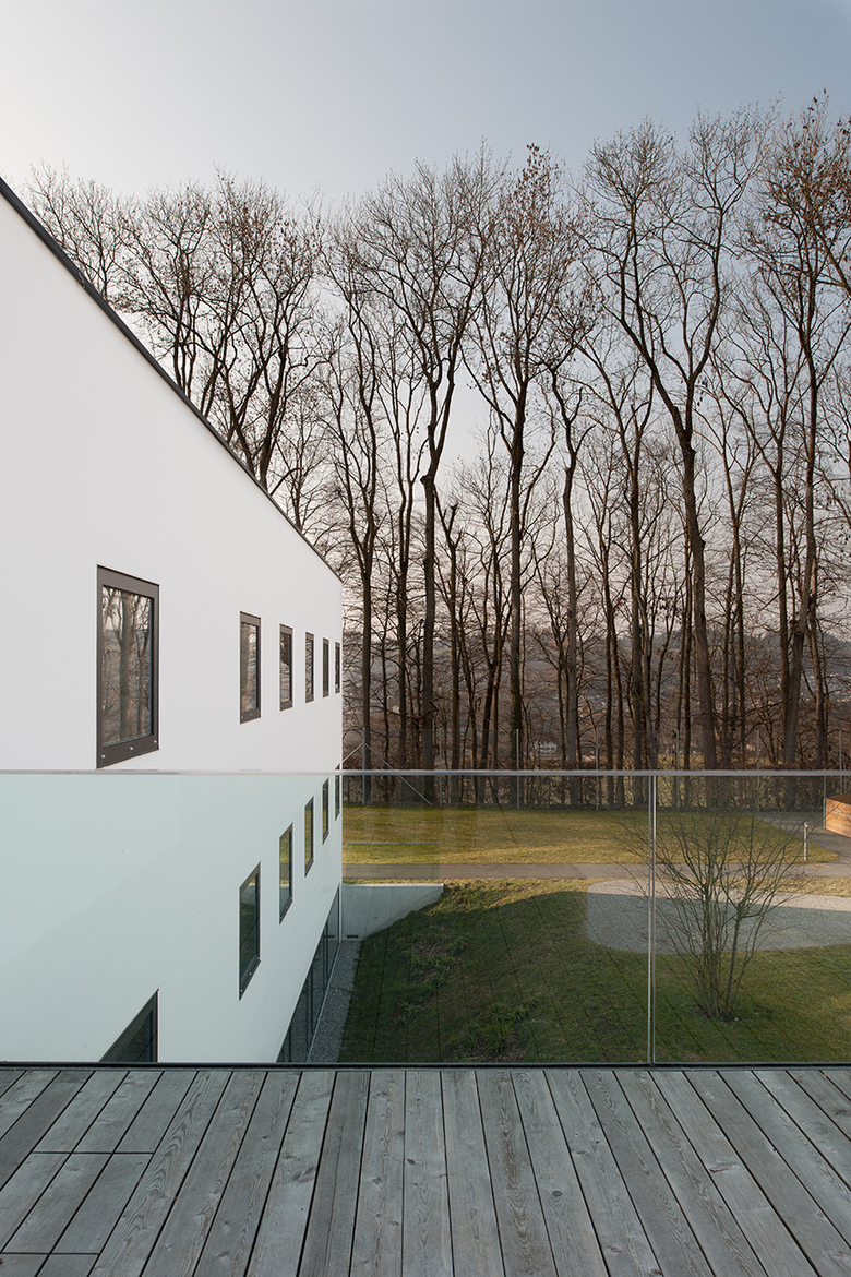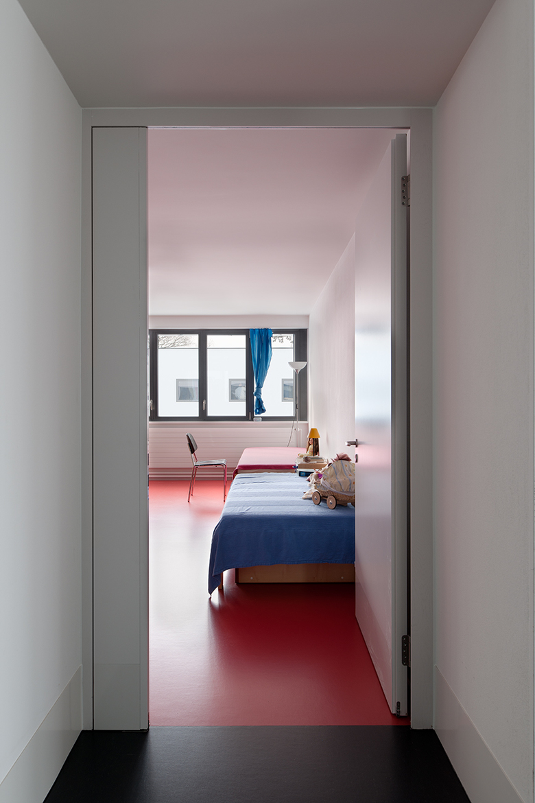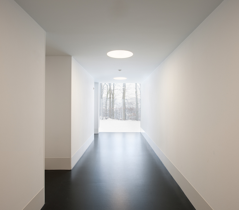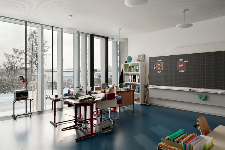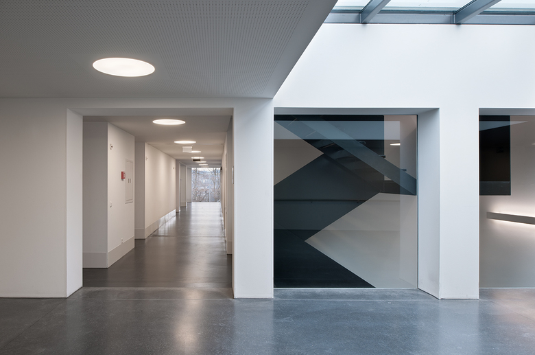Im Inneren bietet der Neubau Raum für grössere Klassenzimmer und für einen Mehrzweckraum. Die Trennung zwischen Schul- und Gruppenräumen und den Wohn- und Therapietrakten wurde eindeutig, und es entstand zugleich ein offener Bezug zu den drei bestehenden Gebäuden. Besonderen Wert legte man auf die Untergeschosse, die dank der neuen Bandfenster vollwertig nutzbar sind.