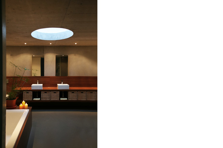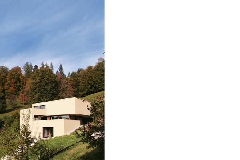 Der zurückgestufte, dreigeschossige Baukörper steht wie eine kleine Burg an einem steilen Westhang. Als letztes Gebäude in seiner Reihe schliesst dieses die Bebauungslücke zum hangseitigen Waldstück. Mittels durchdachter Raumgeometrie und gezielten Öffnungen entsteht ein spannendes Wechselspiel von grosszügigen Ausblicken und sehr privaten Räumen.