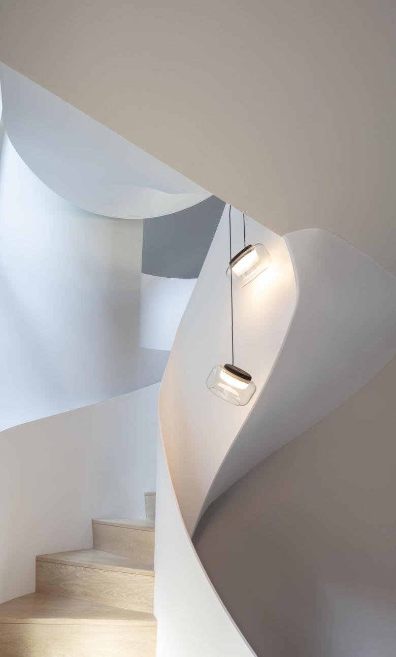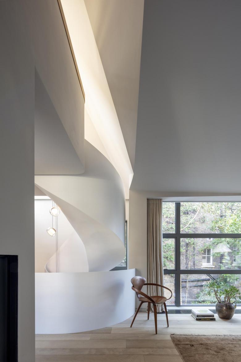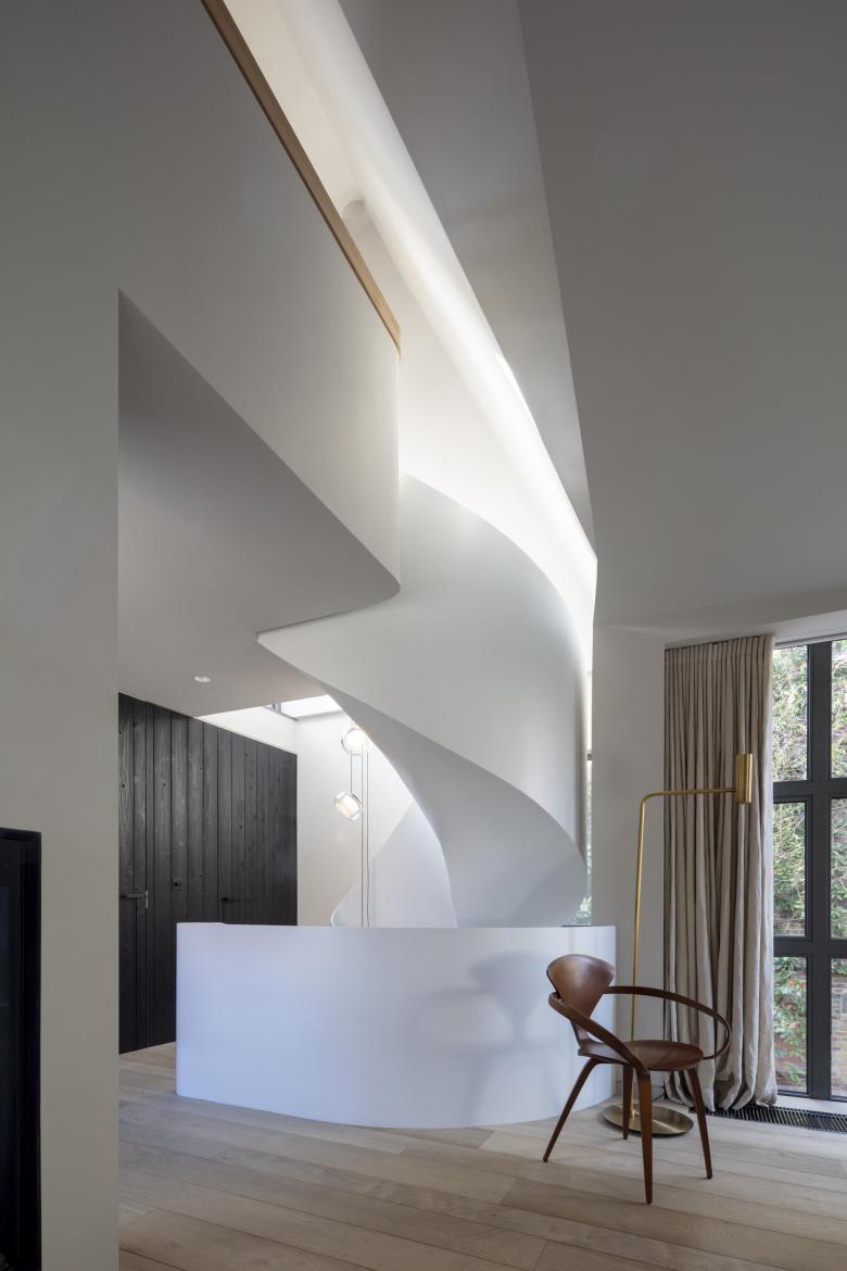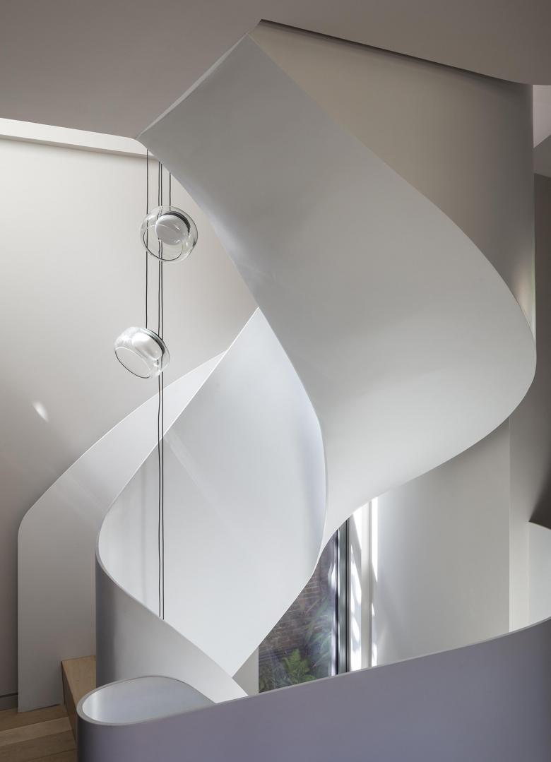 At the heart of the building is a custom-built, winding stair that connects the entrance floor with the double-height living area above and the open kitchen-and-dining on the topmost level. The organic and fluid geometry of this solid-steel helix form connects all public areas of the house in one continuous sweep, thus creating a sculptural vortex of daylit space. Here, density and richness condense together to create a singular object that is both extremely efficient and strikingly beautiful. This stair embodies Archi-Tectonics’ unique sensibility as architects to marry design intelligence, manufacturing expertise, and dynamic form-optimization to go beyond mere problem-solving.