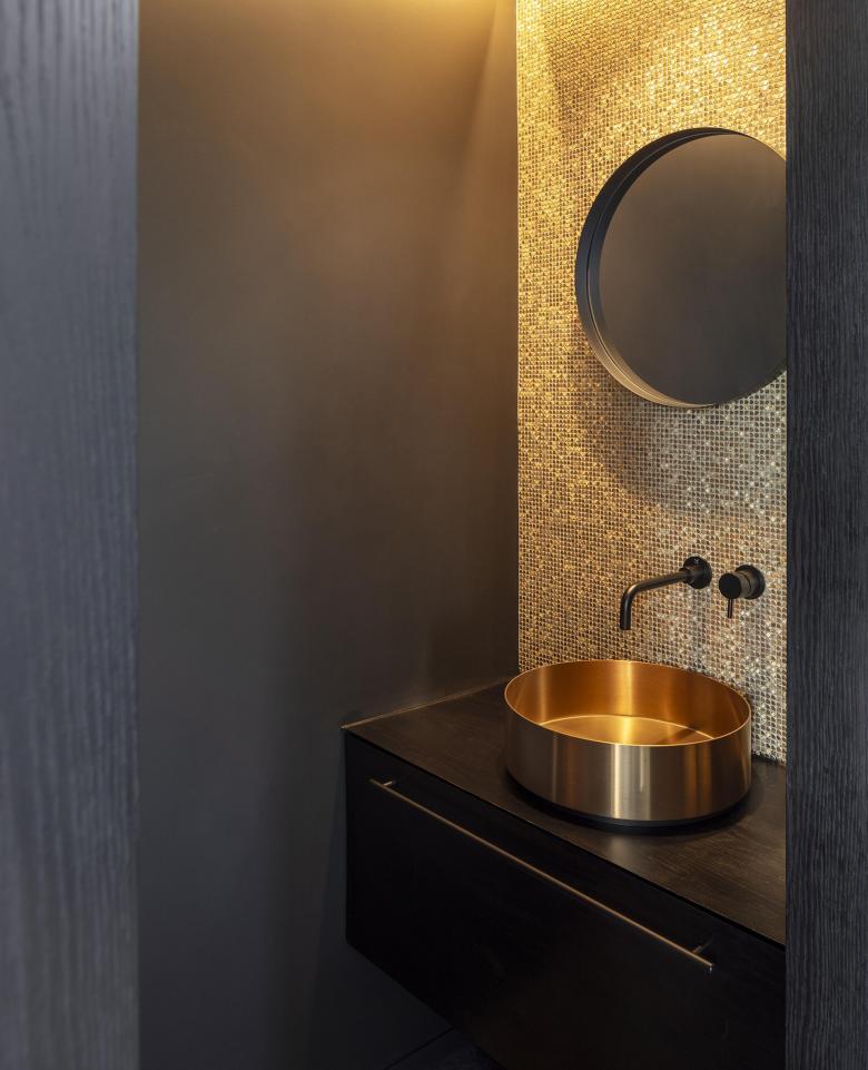 The sculptural corporality and rich textures of the interiors are a deliberate departure from the typically rationalist and frugal effect of compact dwellings. High-contrast black raw wood cladding and cabinetry, textured stone surfaces, and brass mosaics are highlighted by soft glowing light coves. Precious glass pendants elevate the atmosphere indoors, while complementing the organically shaped wood furniture and natural wool rugs.
