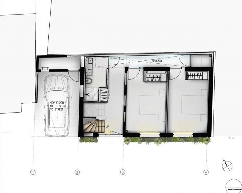 The original structure is left intact to maintain the largely opaque building edges and serve as the foundational base for the new intervention. It is treated as the structural core, off of which a multi-faceted roof extension enveloping an additional story and other hovering projections emerges. The intersection between the folded zinc-and-glass envelope and the densely packed program within generates several distinctly-formed apertures such as the pyramidal skylight in the kitchen, a glass slit in the living room exposing what used to be a narrow rear yard, and a fully glazed window revealing the panoramic view of the streetscape below, framed by an old-growth tree. The terrace at the roof level extends the kitchen and dining room toward the exterior and offers a moment of outdoor respite amidst the surrounding foliage and neighborhood roofscape. The roof is lined with fully integrated PV panels that provide the almost off-the-grid building with baseline electricity sufficient to run heat pumps, hot water supply, lighting, as well as a 13kW Tesla battery to charge an electric car.