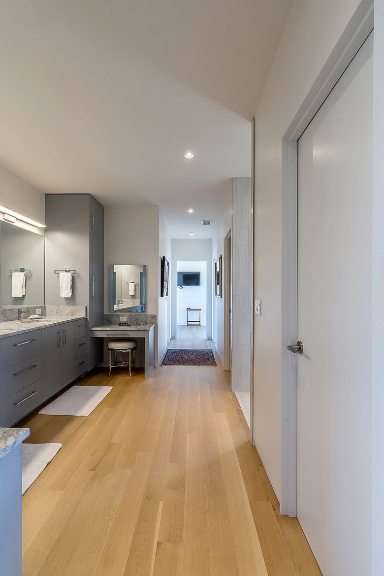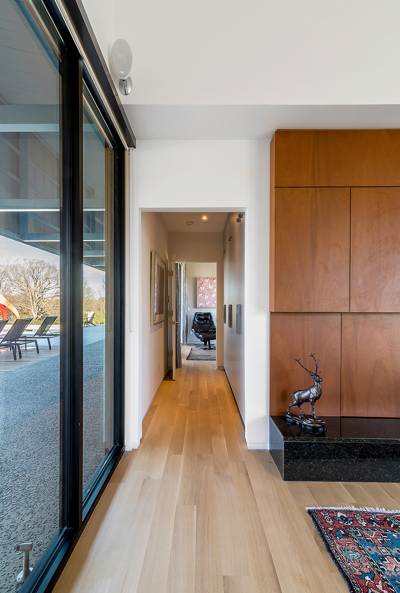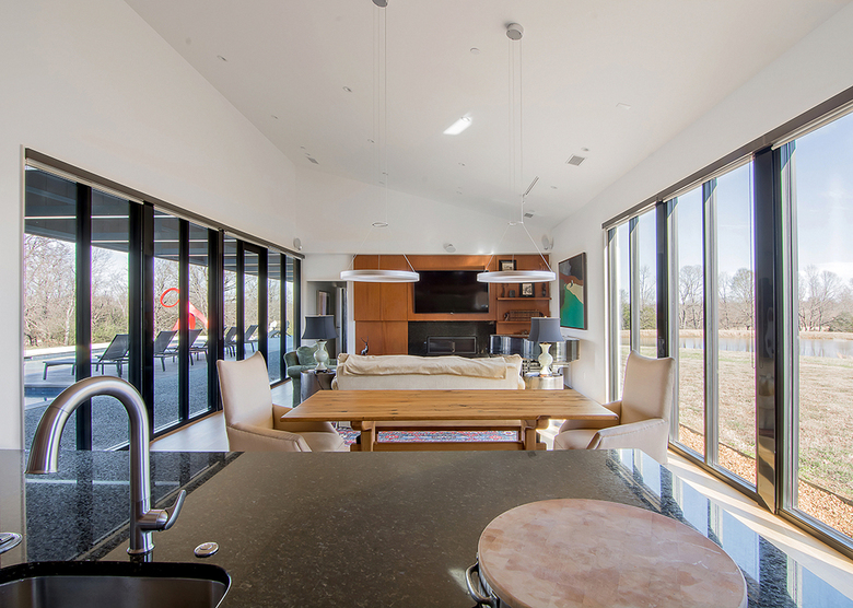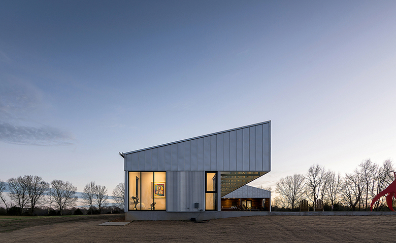 Sited in a cattle pasture in rural Mississippi, this house is a retreat for an active couple to escape busy city life. Appreciating the simple agrarian structures of the region, the clients requested a house that was simple and clean, yet tough and durable. The owners are avid chefs and enjoy outdoor activities like cooking, biking, swimming and dining. A linear bar forms the primary body of the house with its proportions intentionally exaggerated to create a long line when viewed from a distance. The simple form of the shed profile creates a gable when combined with the projection to the rear which frames the pool. The entry sequence begins with a courtyard that punctures the roof and is framed by the screen porch and carport. The screen porch, rear covered porch and the outdoor dining space extend the interior space for outdoor entertaining. Visitors enter into a gallery which continues outdoors under a deep overhang along the edge of the pool. The linear organization of the interior spaces allows the inhabitants to maintain a visual connection to the pastoral landscape from any room in the house. The location of the dog yard and laundry were integral to the design because of the large rescue animals the owners save. A centrally located storm room with concrete walls and ceiling offers a refuge during storms and doubles as a wine cellar. Clad in galvanized metal, the house reflects the changing colors of the sky and landscape and melds into the tall pasture grass much like the old barns of the region.