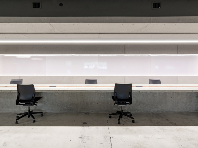 A dynamic collaboration zone established the design concept. This zone is made up of a long poured-in-place concrete table with power and data capability embedded into 40’ long six-inch strip of walnut. A contrasting homasote wall surface helps to separate this collaborative space from the lounge spaces and works to achieve optimal acoustics for discussion and concentration. A linear light overhead lines up with the power and data slots, as well as with the power nine logo at the entrance. This dynamic space accommodates breakout spaces for students to use between classes, offers space for temporary workstations, a surface for tech start-up company meetings and as a serving table for public events.