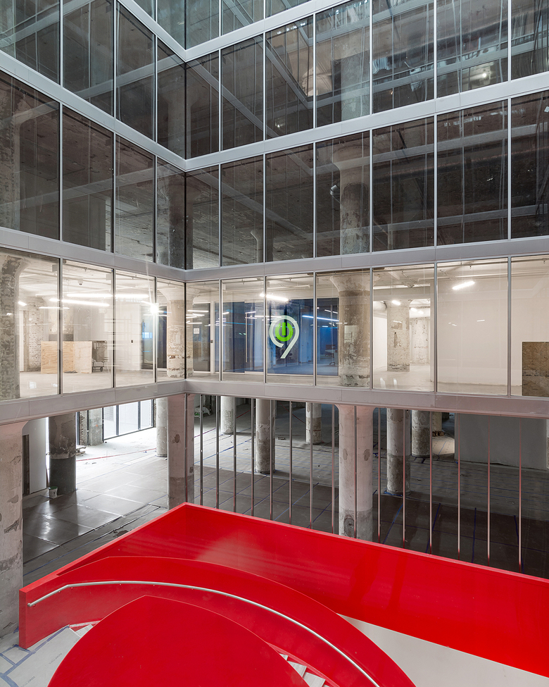 Extending the design emphasis on collaboration, a conference room doubles as a small training, testing or war room. Glazing is used to partition smaller offices to achieve openness and light to pass through the lounge. Additionally, marker board paint covers the walls for informal meeting spots at every seating area.