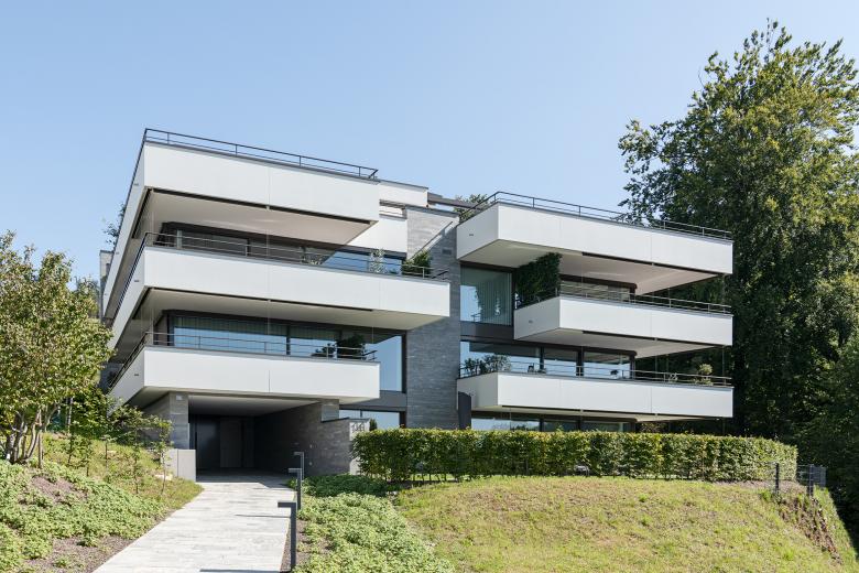 Oberhalb der Stadt Zug am Fusse des Zugerbergs gelegen, wurde der Rötelberg von der Stadt selbst als eine von fünf sogenannten «Perlen» auserkoren: Orte, deren spezielle Nutzung mit hohen Anforderungen an die städtebauliche, landschaftliche und architektonische Gestaltung einhergeht. Auf knapp 12‘000 m2 Land, unweit der Verenakapelle aus dem 18. Jahrhundert, entstanden vier Mehrparteienhäuser. Horizontale Elemente prägen den Entwurf. Die vier individuellen Baukörper, die sich aufgefächert präsentieren und leicht abgedreht dem Hügel entlang platziert sind, sorgen dafür, dass ein Wechselspiel mit der Umgebung stattfindet. Die Wohnüberbauung «Rötelberg» mit 32 hochwertigen Eigentumswohnung bietet trotz des verdichteten Bauens viel Privatsphäre und Flexibilität im Grundriss.