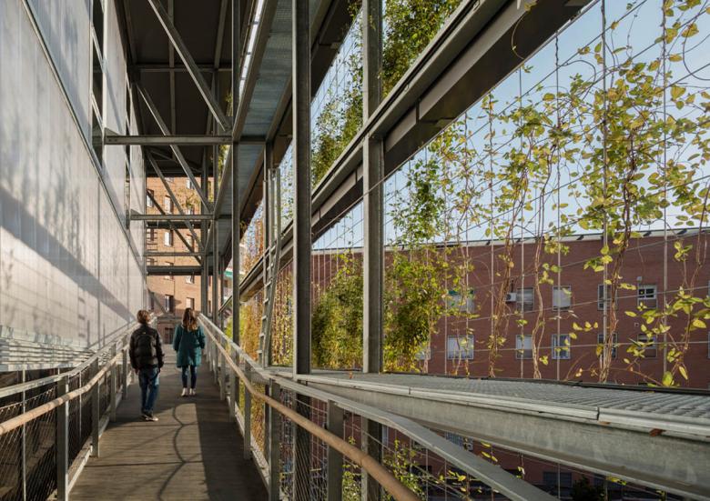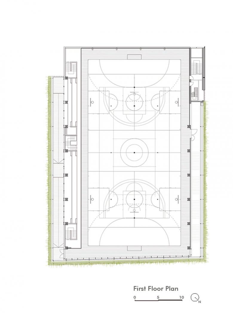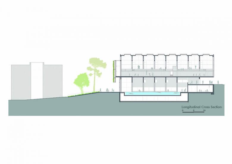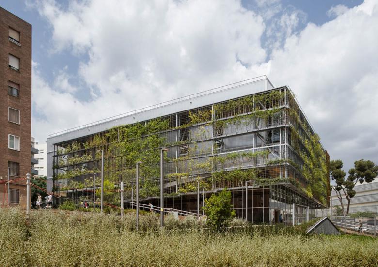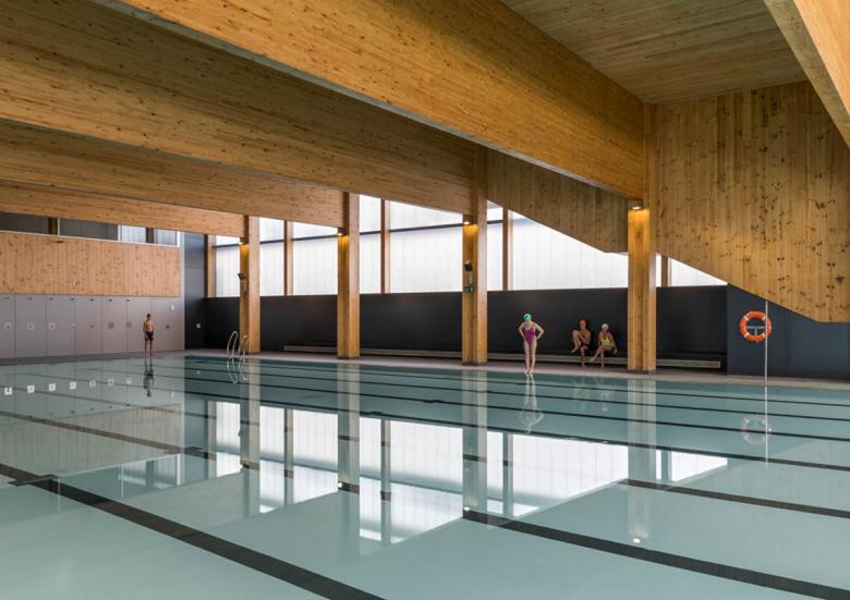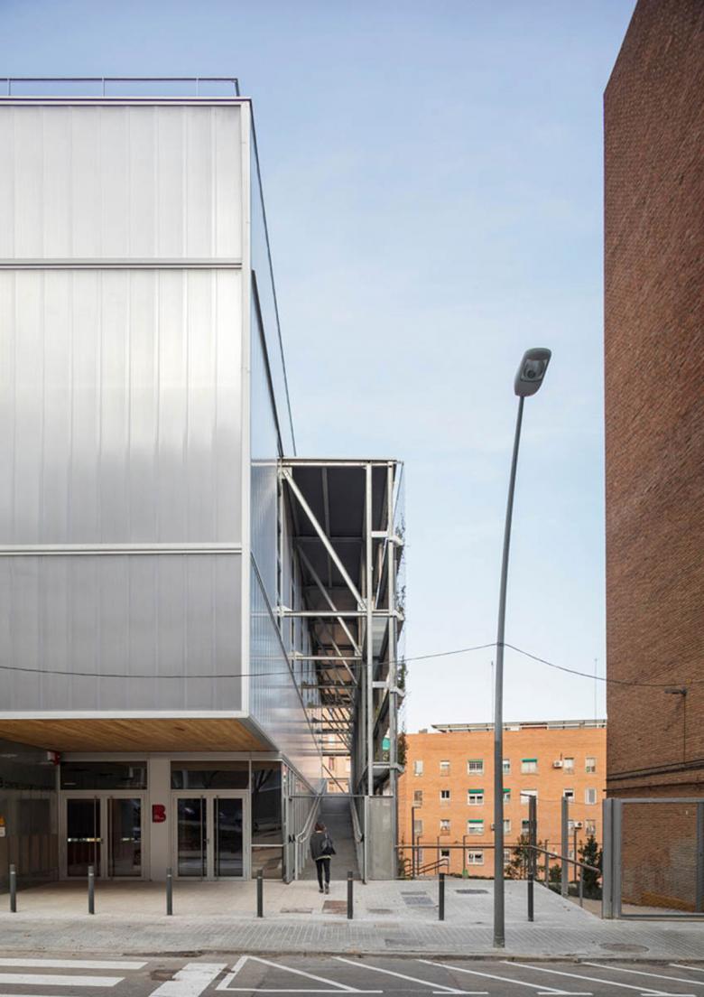 An integral urban regeneration concentrates two preexisting facilities in a single sports building, to free space and create a large garden that has become a place of social relations. The building is developed with passive architecture criteria and materials of low ecological footprint. The green facade and the use of wood provide a warm atmosphere. The intervention is located at Turó de la Peira, a low-cost social housing neighborhood with a high building concentration. The urban environment prior to the construction was an unstructured space consisting of a sum of residual spaces of hard pavement, a space occupied by a sports court tucked between neighboring buildings and a pool of obsolete facilities. The concentration of the two facilities allowed to free space to create a new garden, a place that provides quality of life and support to biodiversity, and is the preamble to the new facility. The Sports Center consists of two overlapped large spaces; a heated swimming pool on the semi-basement floor and a sports court on the upper floor. The building has an urban facade to the street and minimizes its impact with a green gallery that surrounds it. The volume is one more element of the garden, not mimicking but dialoguing with it. The project had to deal with a degraded and inhospitable environment, in a low-cost social housing neighborhood. The existing pool before the intervention was damaged and the outdoor sports court was too small for competitions and caused noise disturbances to the neighbors. The project's commission as the result of a competition, was to design a very sustainable building, but always taking into account the cost, since it was a public facility. The strategy was a comprehensive operation that regenerated the environment through renaturalization, an environmental regeneration and as a consequence a social improvement. The intervention would turn a grey and inhabitable environment into a green, welcoming and friendly place. The green gallery and the wooden construction are the most remarkable elements. They are natural, with none ecological footprint, and user friendly. The passive architecture criteria construction has achieved a very energy efficient building. The monitoring of the building has verified that the energy costs of maintenance are one third of a building of similar characteristics. The investment made will be recovered in a few years. The excellent characteristics of the wood in relation to its lifecycle, was one of the reasons for choosing the prefabricated system in laminated wood. The entire structure, pillars, girds, slabs and walls were prefabricated in the workshop and assembled on site. It was also assessed its good mechanical performance, its lightness and its short construction time. A green gallery surrounds the building by filtering the light and protecting from solar radiation. The plantation system is hydroponic, chosen for its lightness and water retention capacity. A tank collects rain water for recycling and use for the entire irrigation. The passive architecture solutions are: • Skylights and windows, monitored by sensors for temperature, humidity, co2 and rain, ensuring proper cross-ventilation. • A compact and embedded volume in the ground that minimizes the facade surface avoiding thermal losses. • A thermal insulation of the whole enclosure selectively treated according to solar orientation. • An aero-thermal system that allows the recovery of heat for the production of hot water. • Photovoltaic panels on the roof generating 90% of the energy in the building.